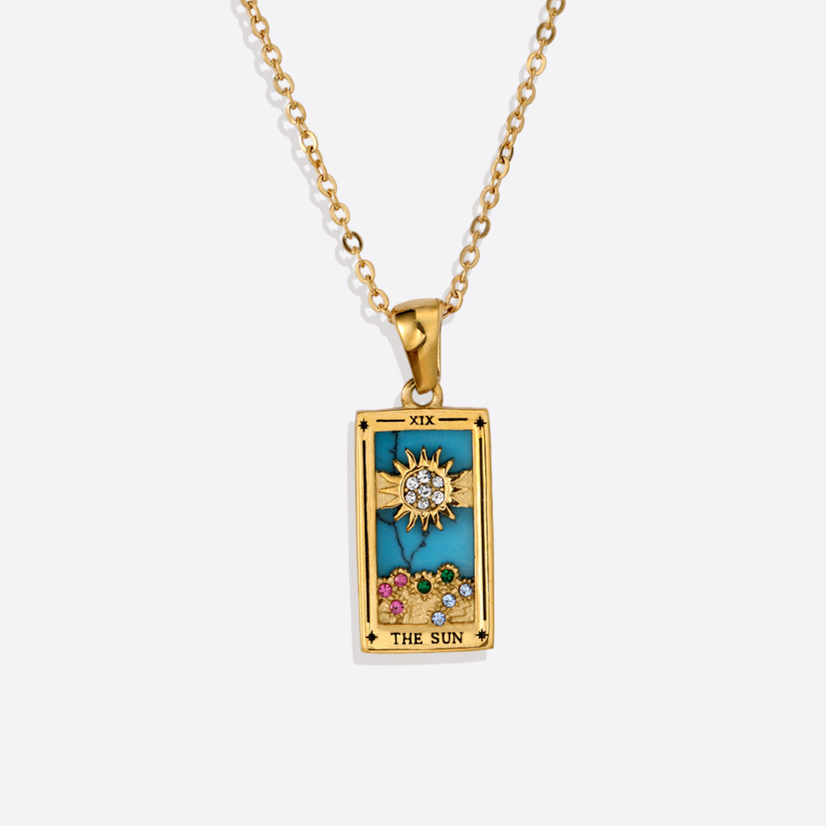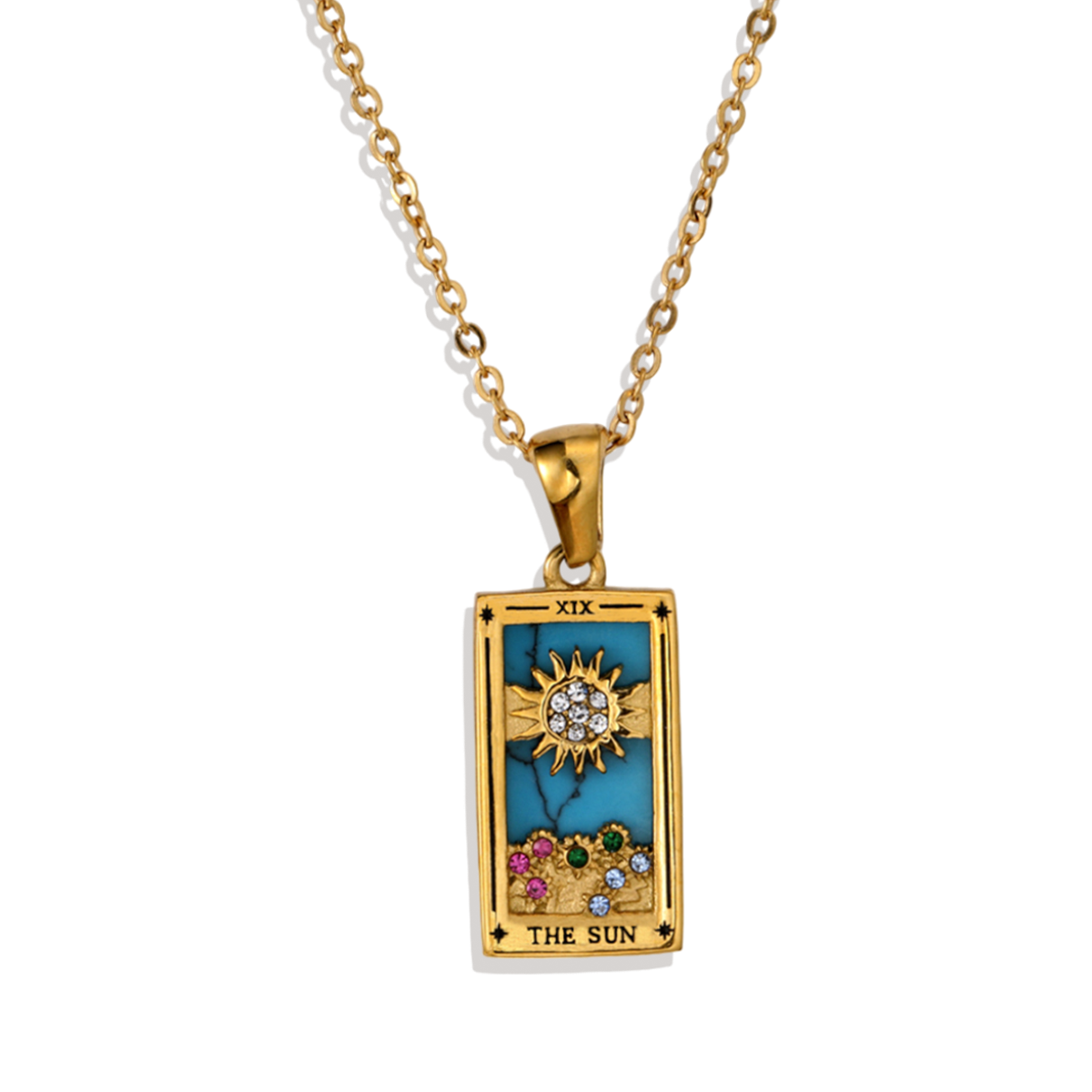 Mint & Lily's The Sun Tarot Necklace radiates positivity, vitality, and success, capturing the joyful essence of The Sun card in tarot. This uplifting piece features a beautifully crafted pendant depicting the bright and vibrant Sun, symbolizing clarity, joy, and optimism. Ideal for those who seek to bring light into their lives and the lives of others, this necklace is a celebration of new beginnings, happiness, and the fulfillment that comes from achieving one's goals. Perfect for wearing as a daily reminder of your own inner light or as a cheerful gift to brighten someone's day, The Sun Tarot Necklace is a beacon of encouragement and warmth.