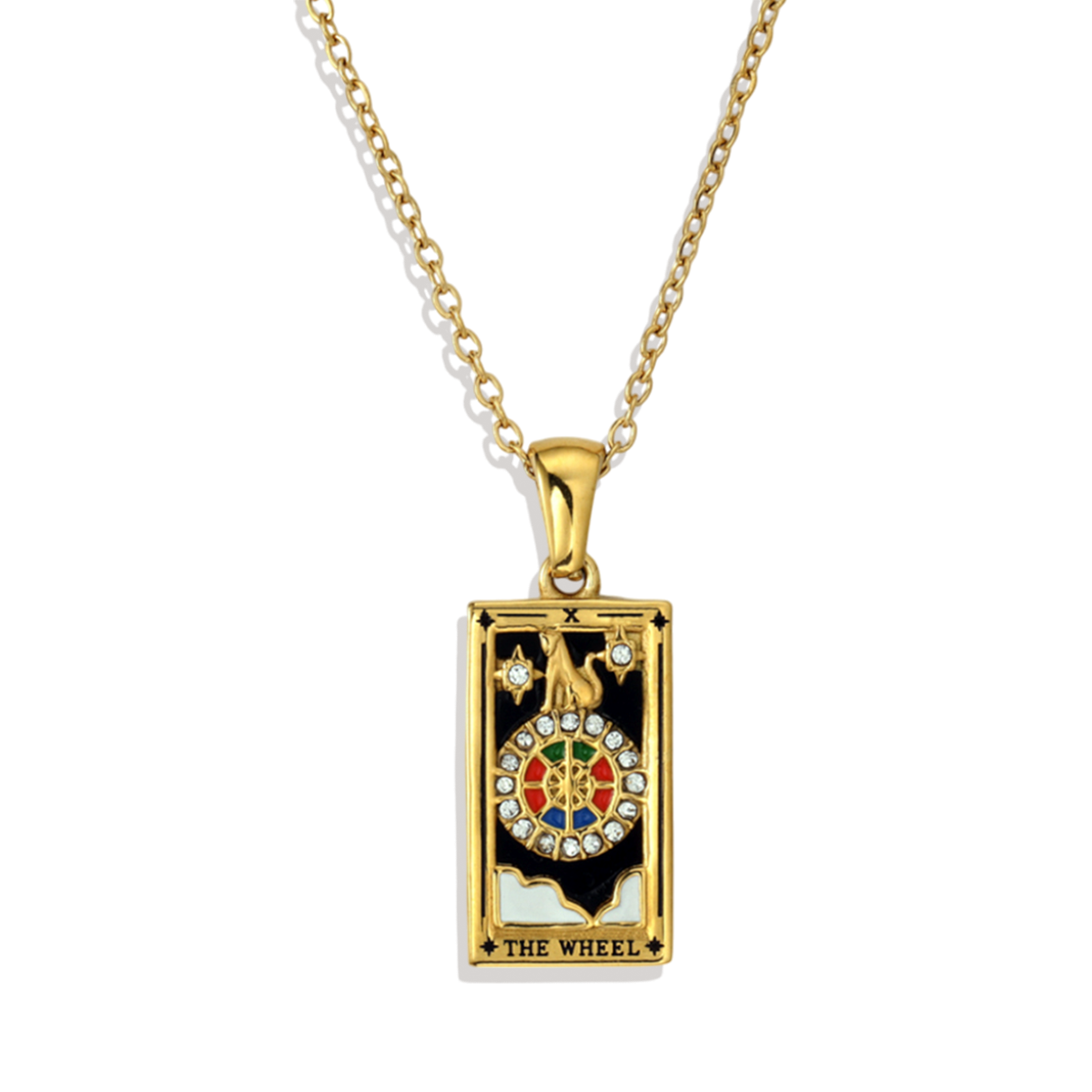 Mint & Lily's The Wheel Tarot Necklace beautifully captures the dynamic essence of change, cycles, and destiny, which are central to The Wheel of Fortune card in tarot. This intricately designed piece features a pendant depicting the iconic wheel, symbolizing life's constant flux and the opportunities that arise from the ebbs and flows of fortune. Ideal for those who embrace change or are navigating significant transitions, this necklace serves as a potent reminder of the natural progression and transformative power of life's cycles. It’s perfect for inspiring resilience and optimism, making it a thoughtful gift or a personal talisman to wear as you face the ups and downs of your journey.