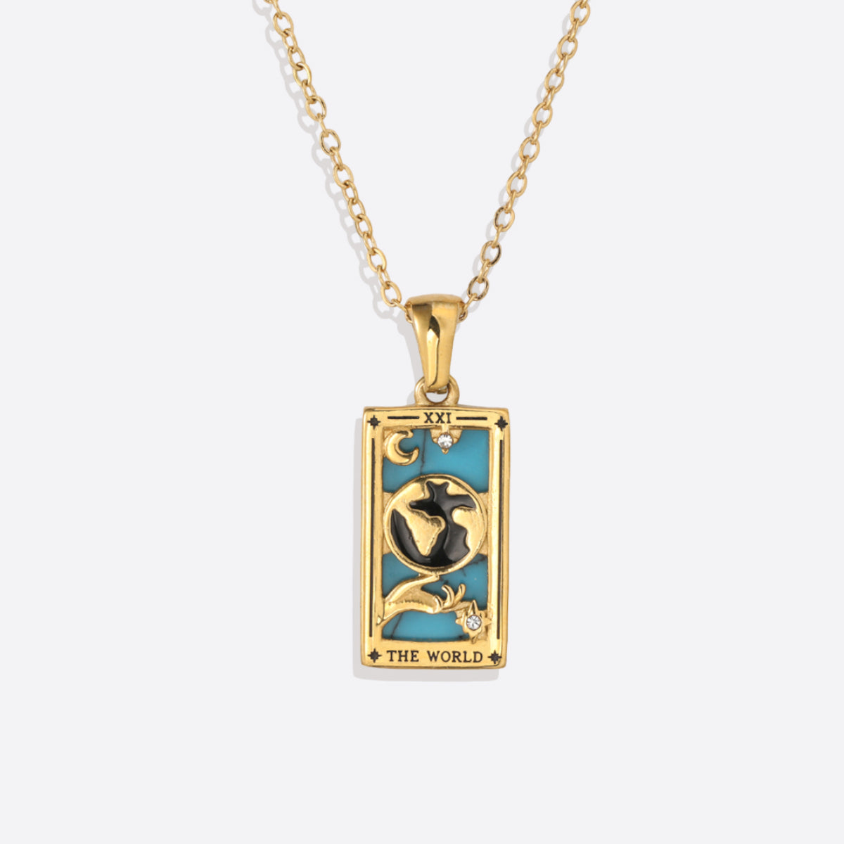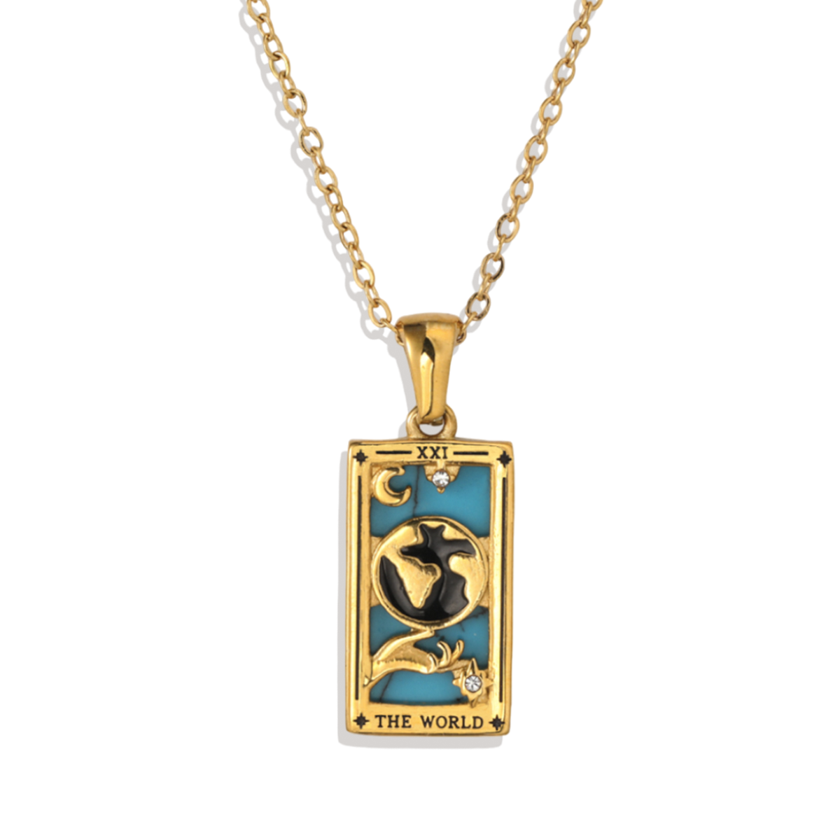 The World Tarot Necklace is a stunning representation of fulfillment, achievement, and completion, embodying the essence of The World card in tarot. This exquisite piece features a pendant that captures the intricate imagery of The World card, symbolizing a successful end to a journey and the beginning of a new cycle. Suspended on an elegant chain, this necklace is perfect for anyone celebrating a major milestone or embracing a new chapter in life. It serves as a beautiful reminder of the interconnectedness of all things and the global unity that The World represents. Ideal for daily inspiration or as a thoughtful gift to commemorate special achievements.