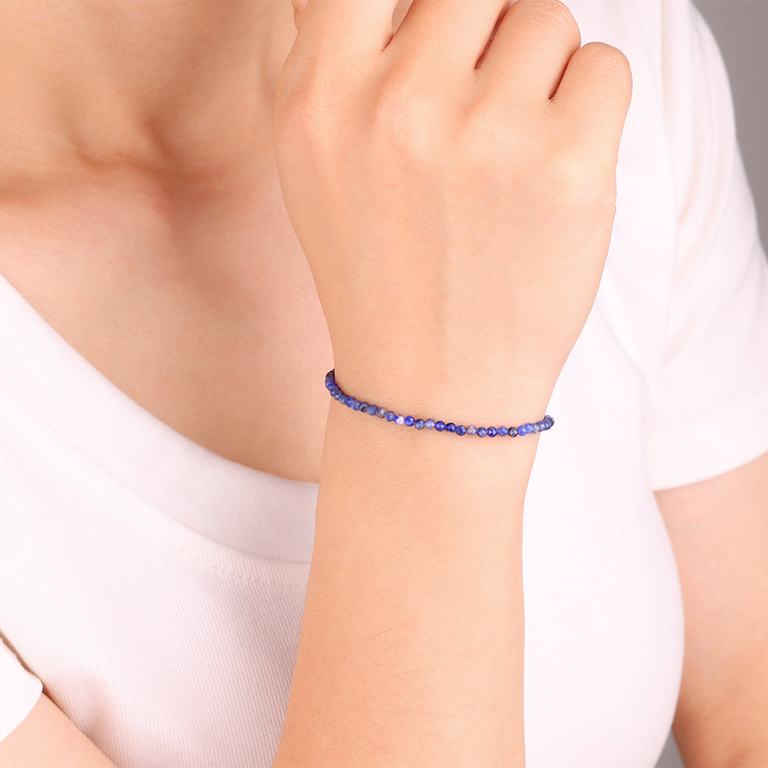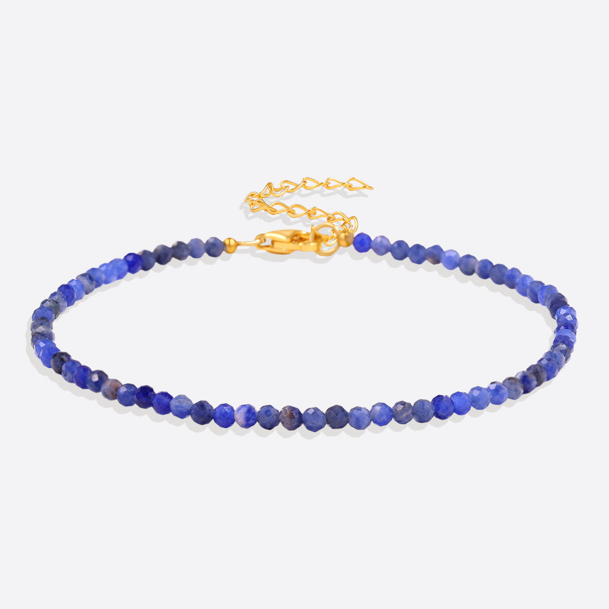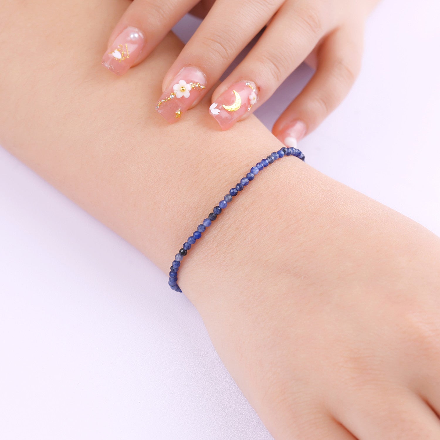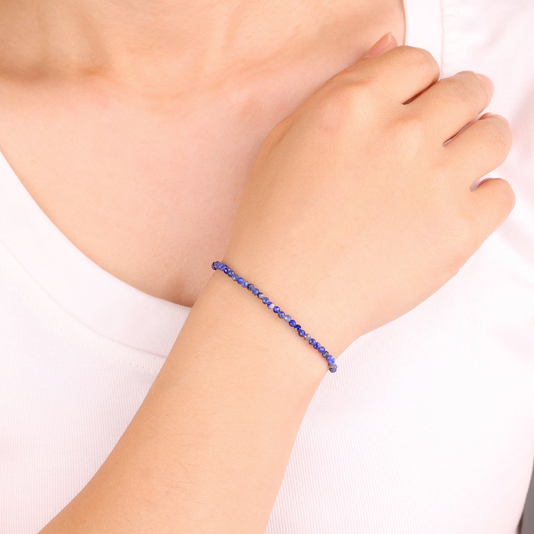 This dainty bracelet is strung with rich, deep blue lapis lazuli beads, offering a touch of elegance and a pop of color. Perfect for stacking or wearing solo, it adds a subtle, sophisticated charm to any outfit, and the natural properties of lapis lazuli are thought to promote wisdom and truth.