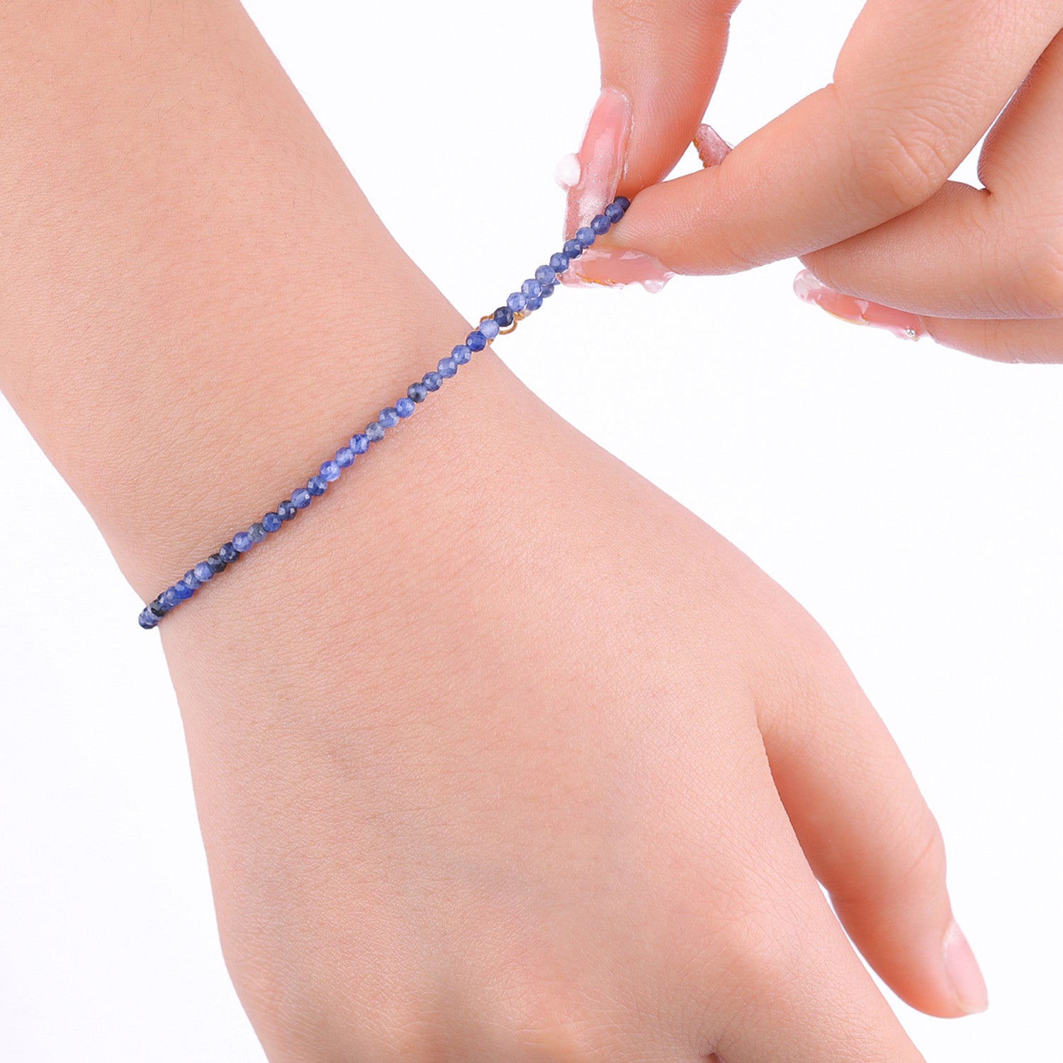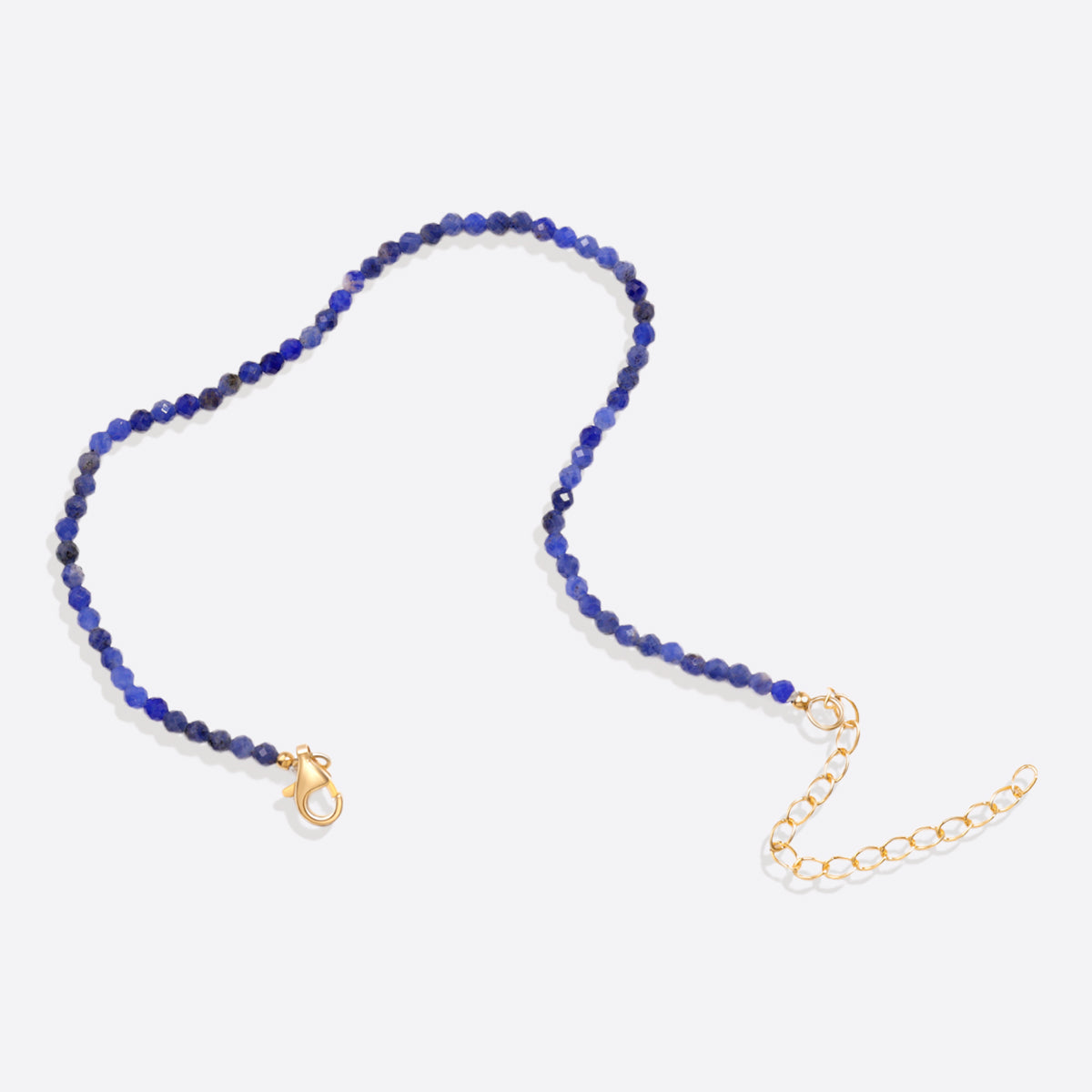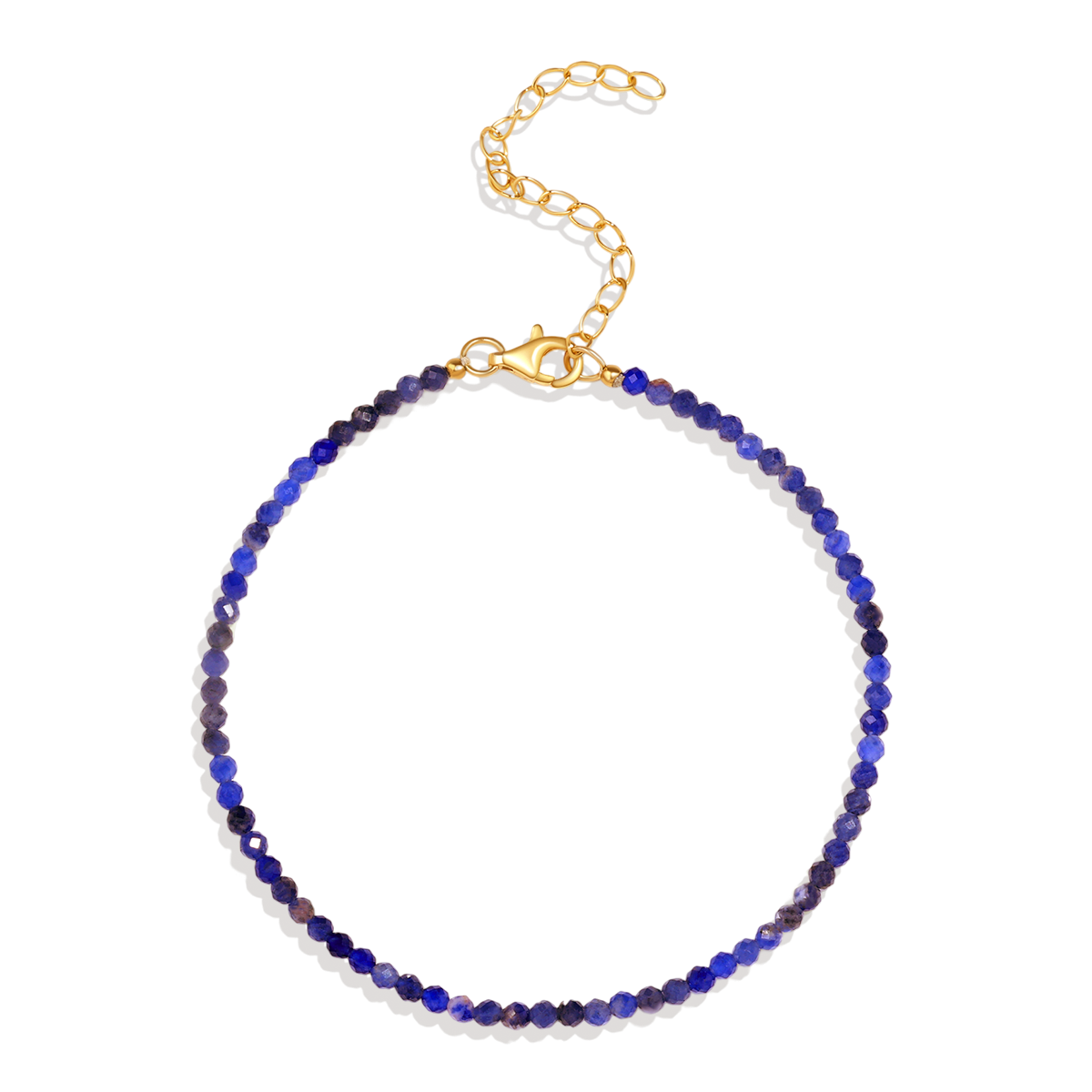 This dainty bracelet is strung with rich, deep blue lapis lazuli beads, offering a touch of elegance and a pop of color. Perfect for stacking or wearing solo, it adds a subtle, sophisticated charm to any outfit, and the natural properties of lapis lazuli are thought to promote wisdom and truth.