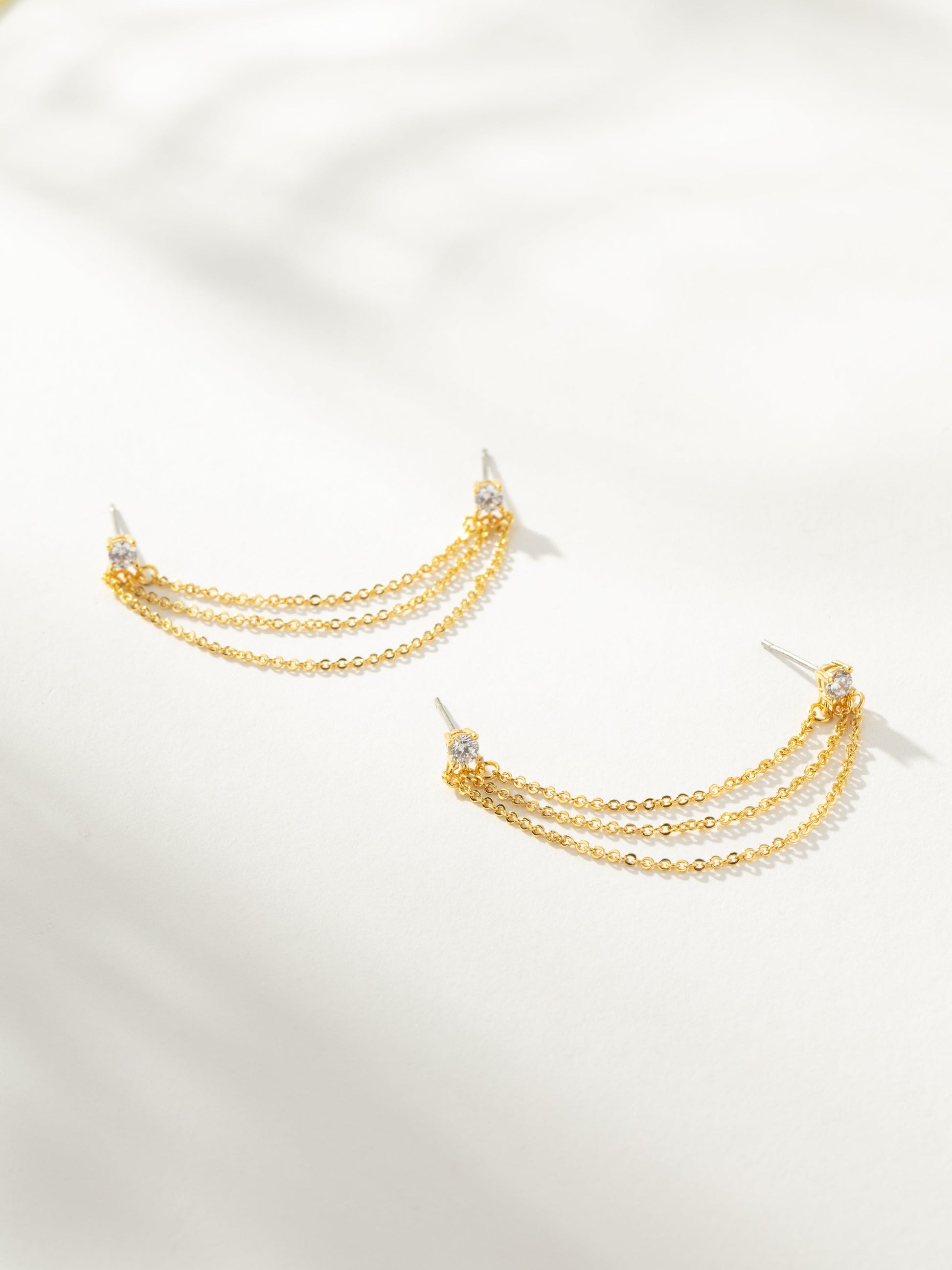 When you don’t want to leave any ear piercing out, the Triple Chain Ear Climber is for you. With two studs connected by three gold chains, these gold ear climber earrings have your whole ear covered.