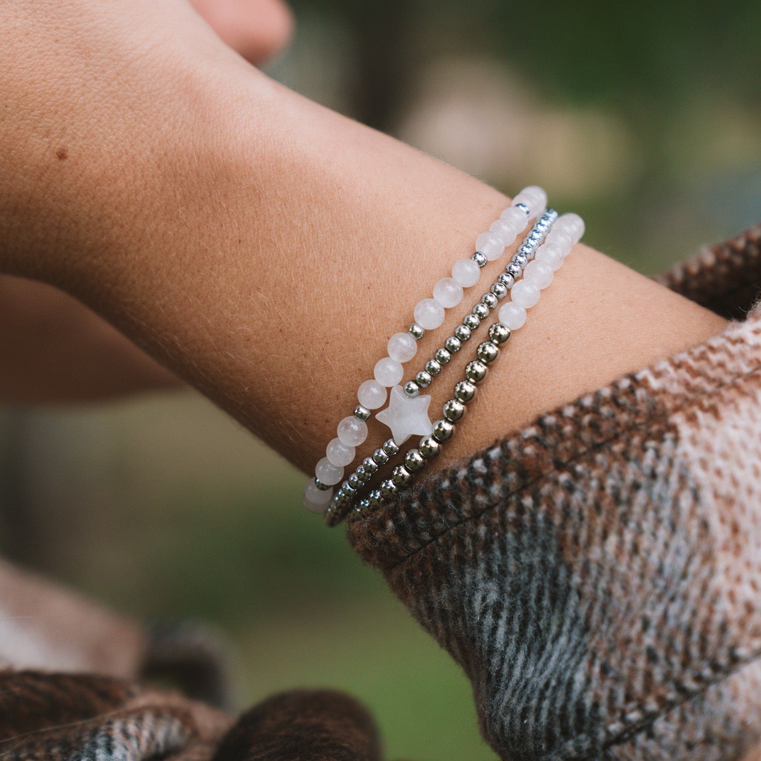 The White Quartz Star Stretch Bracelet features radiant white quartz beads with a star-shaped charm, symbolizing positivity and clarity. Designed with a comfortable stretch fit, it’s easy to wear and perfect for stacking or as a standout piece. Ideal for gifting or treating yourself to a bit of everyday sparkle.