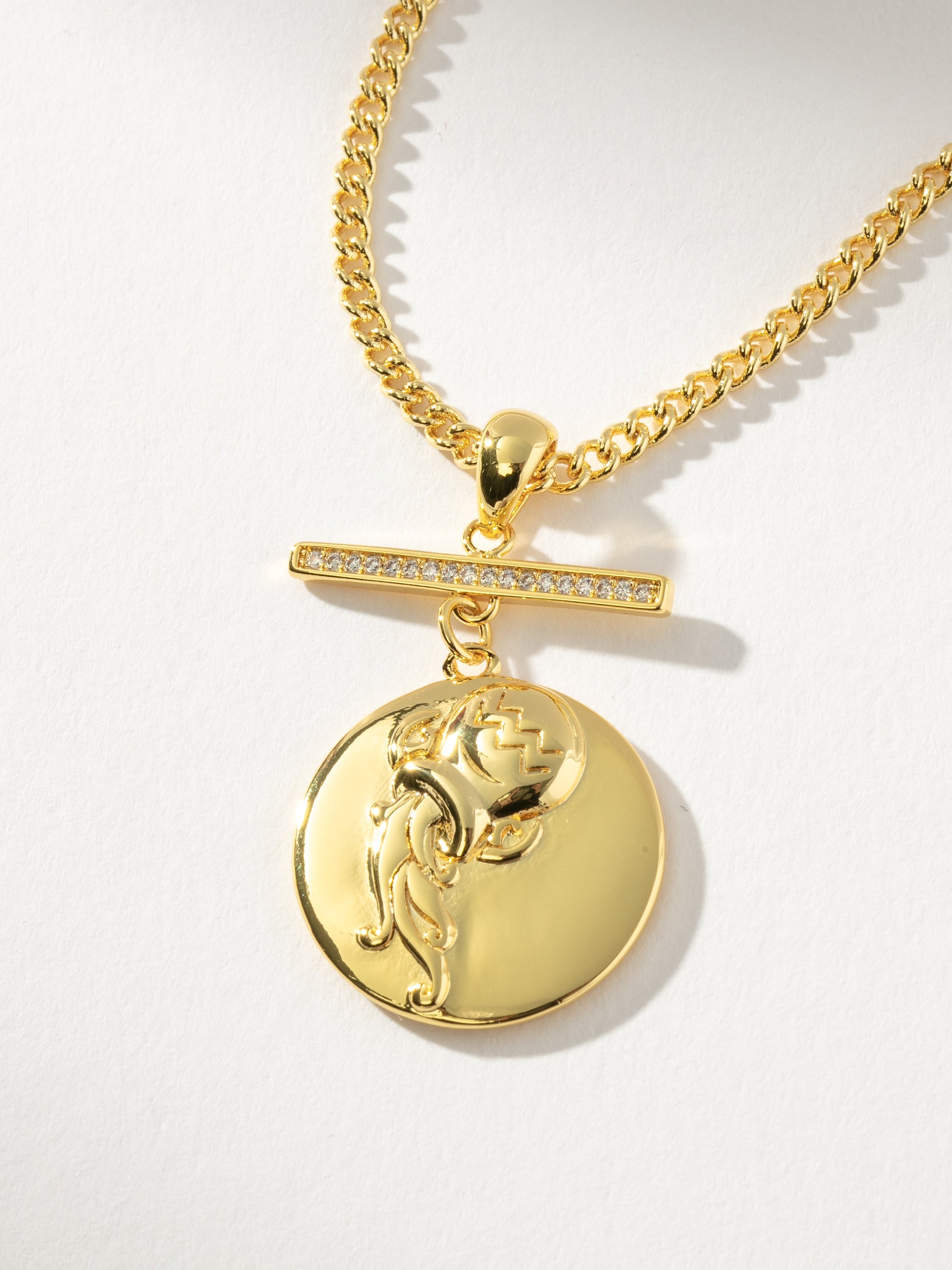 Show off your sign with our Zodiac Pendant Necklace. This statement chain necklace features a bar detail with a large circle zodiac pendant right below. Layer this with some shorter, choker style necklaces for a fully stacked look.