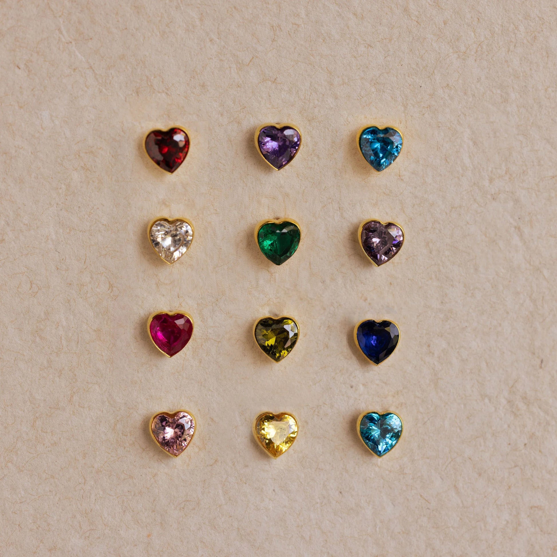 Our Bezel Heart Birthstone Studs are a sweet and stylish choice, letting you pick your favorite gemstone for a personal touch. Perfect for adding a bit of charm and sparkle to any outfit!