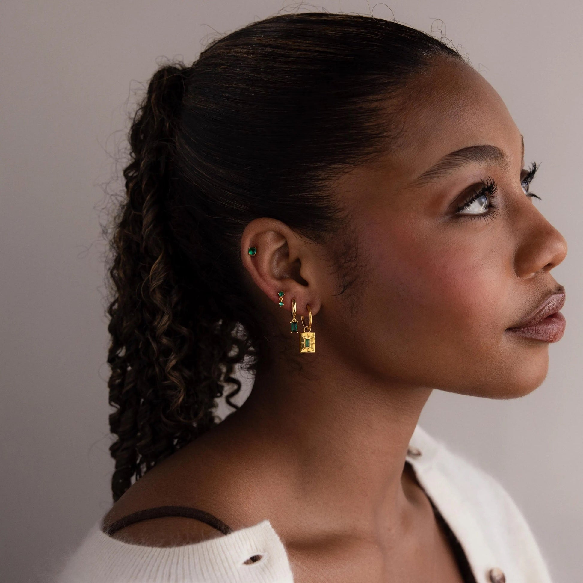 - Model showcases a delicate, art deco stacking look featuring our Booker Large Birthstone Studs, Birthstone Drop Studs, and Baguette Birthstone Huggies