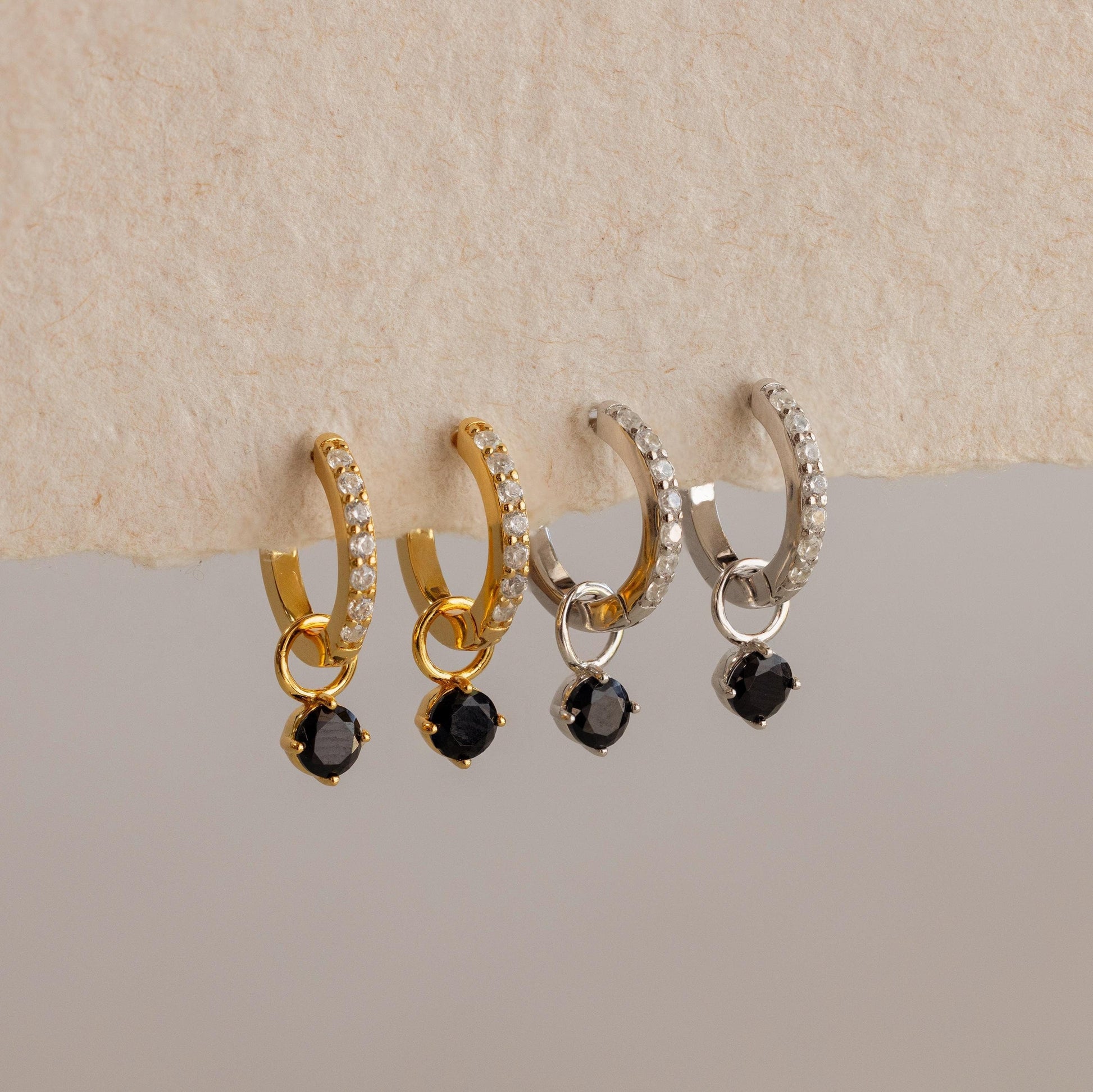 - Featuring ~1.5mm Pave CZ Diamond Huggie Earrings with a dangling ~4mm Black CZ Stone Charm