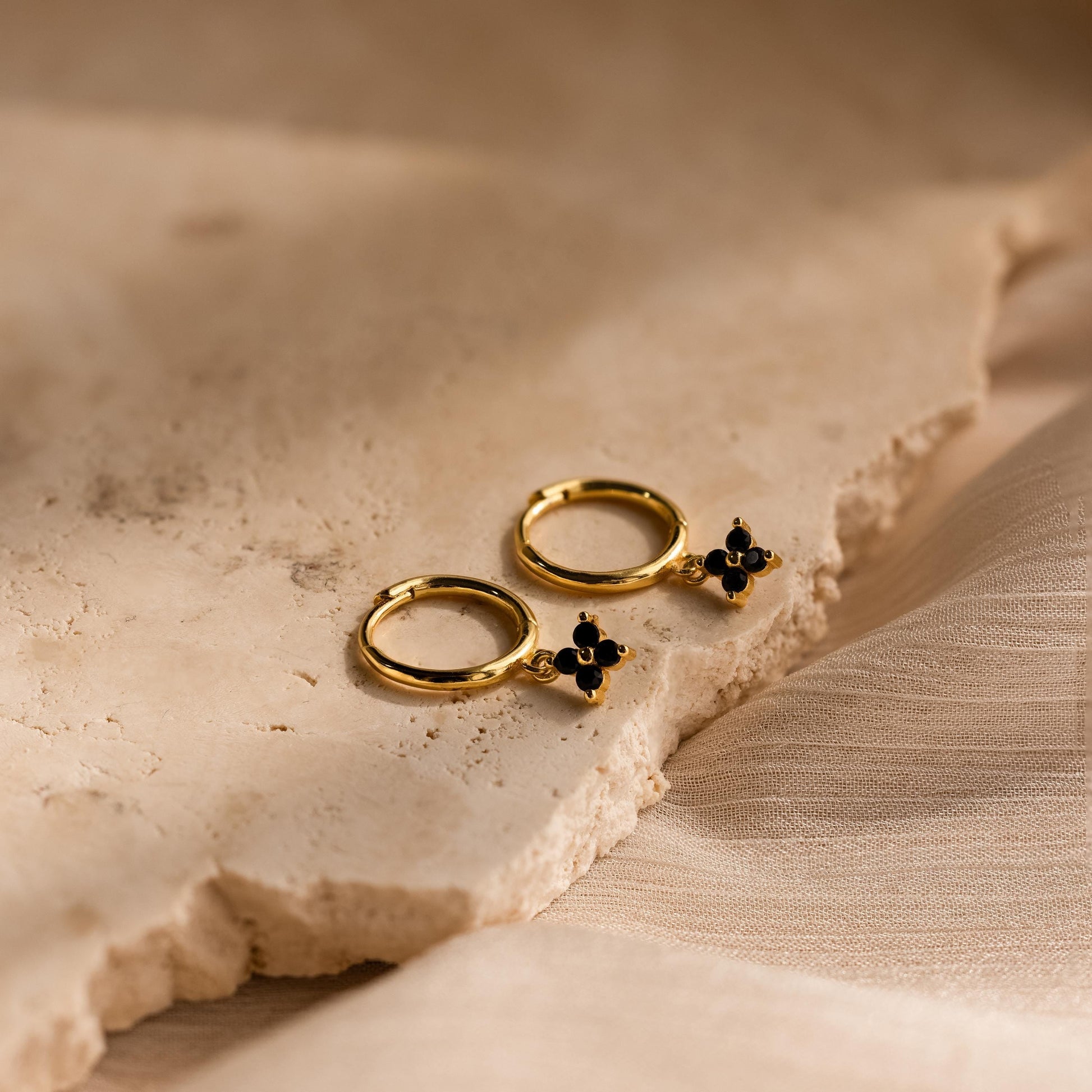 - Featuring ~1.5mm wide Huggie Hoop Earrings with a dangling ~5.5mm Black CZ Diamond Flower Charm