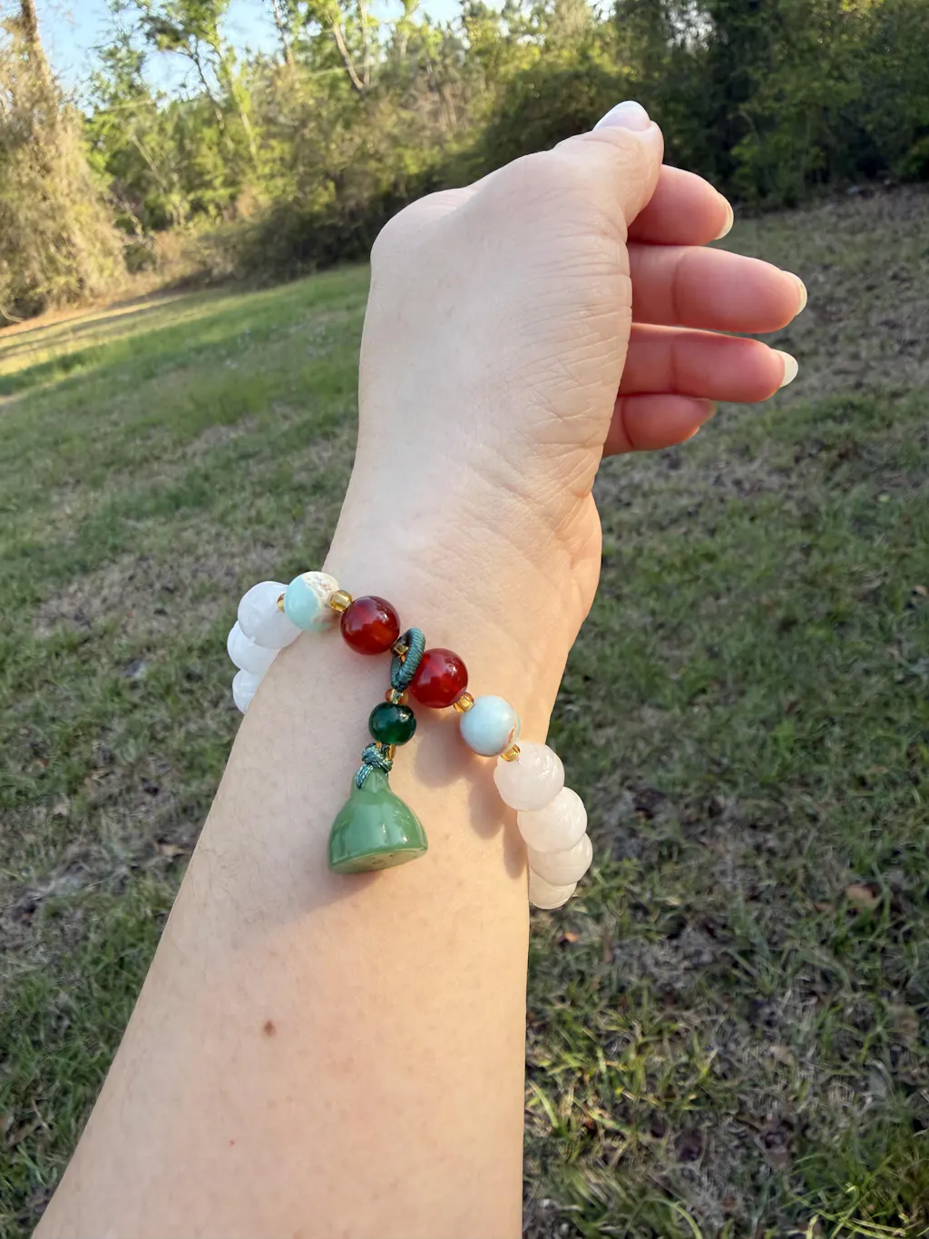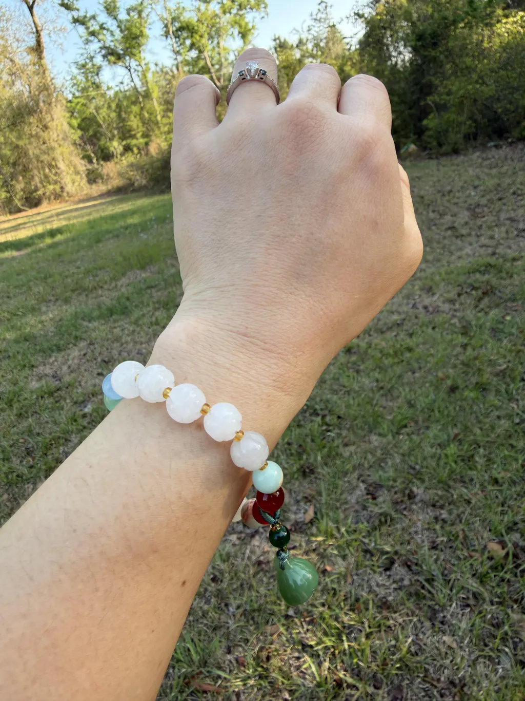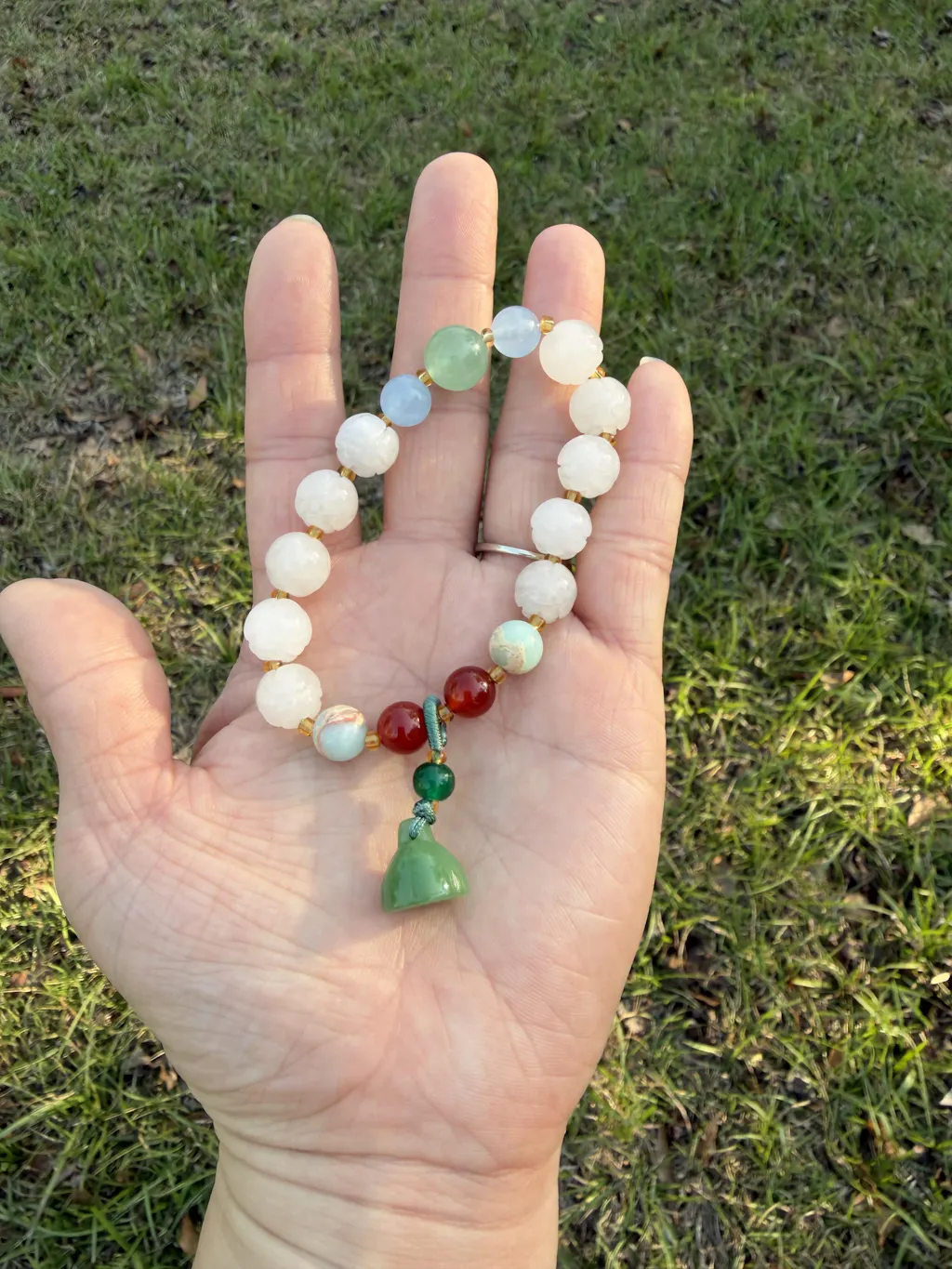 Bracelet is very pretty! Prettier than what I saw in photos. I love the each lotus has slightly different color white.