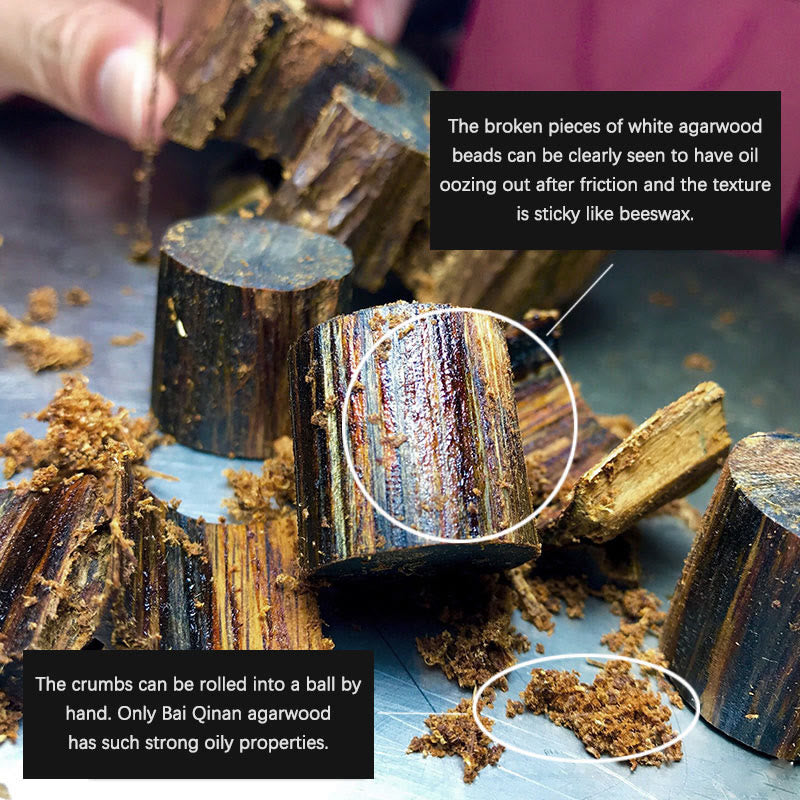 It is full of oil and is about to burst out. It is soft and sticky like paste or wax. It will leave fragrance immediately when you touch it lightly. The Bai Qinan agarwood beads have oil spilling out after friction and heat generation, and the texture is sticky like beeswax. The scraps can be twisted into a ball by hand, and only Bai Qinan agarwood has such strong oil properties. The oil content is amazing. Oil will leak out immediately when exposed to fire. -