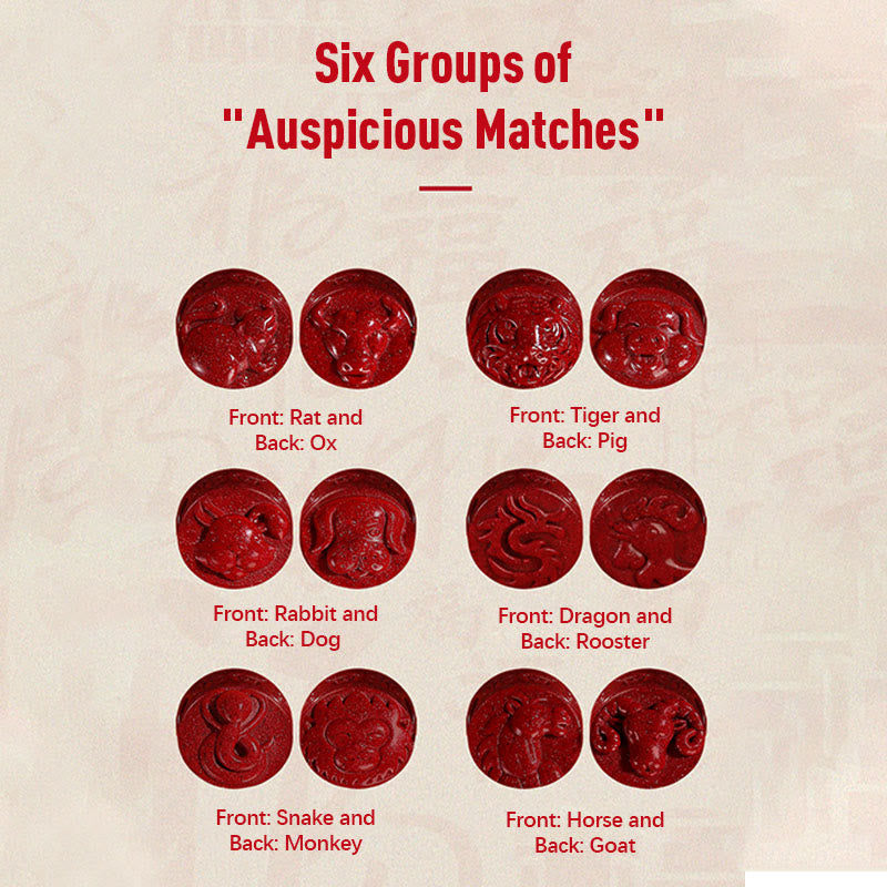 Six groups of "Auspicious Matches": Rat and Ox, Tiger and Pig, Rabbit and Dog, Dragon and Rooster, Monkey and Snake, and Horse and Goat imply mutual support, and harmony and complement each other, and everything goes well with unexpected help.