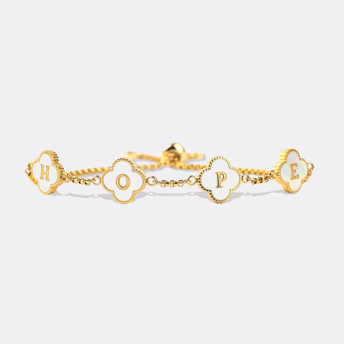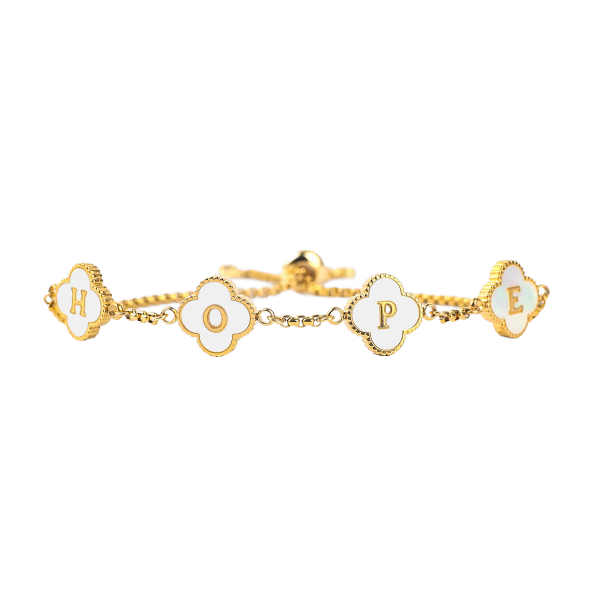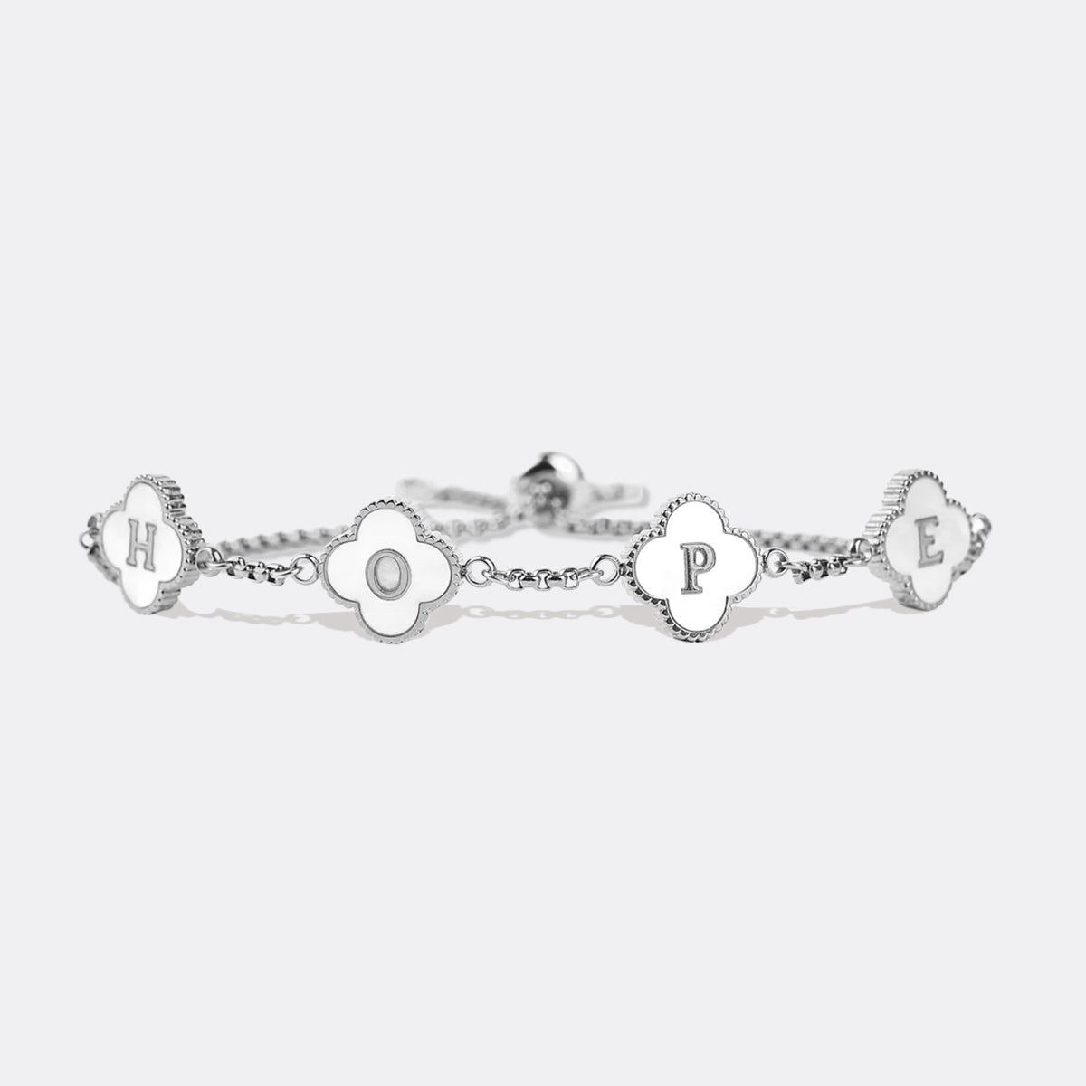 Celebrate uniqueness with the Clover Custom Name Bracelet. This charming piece features individual letters displayed on Mother of Pearl clovers, allowing you to spell out a name or meaningful word. Its playful design makes it a perfect gift for someone special or a fun addition to your own accessory collection. Add a touch of whimsy and personalization to your style!