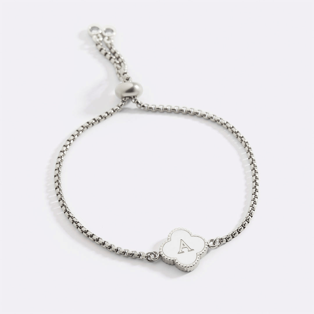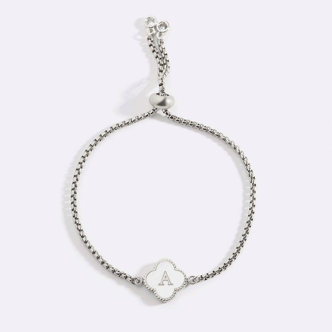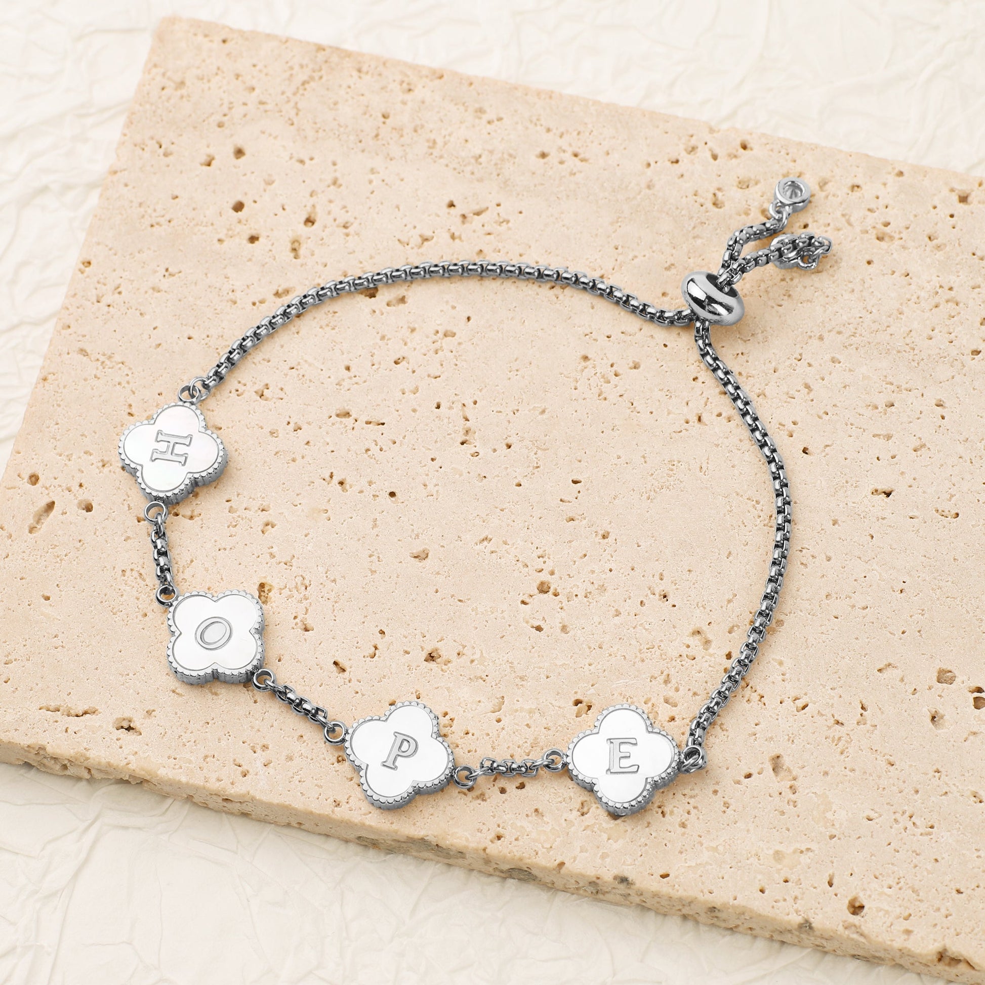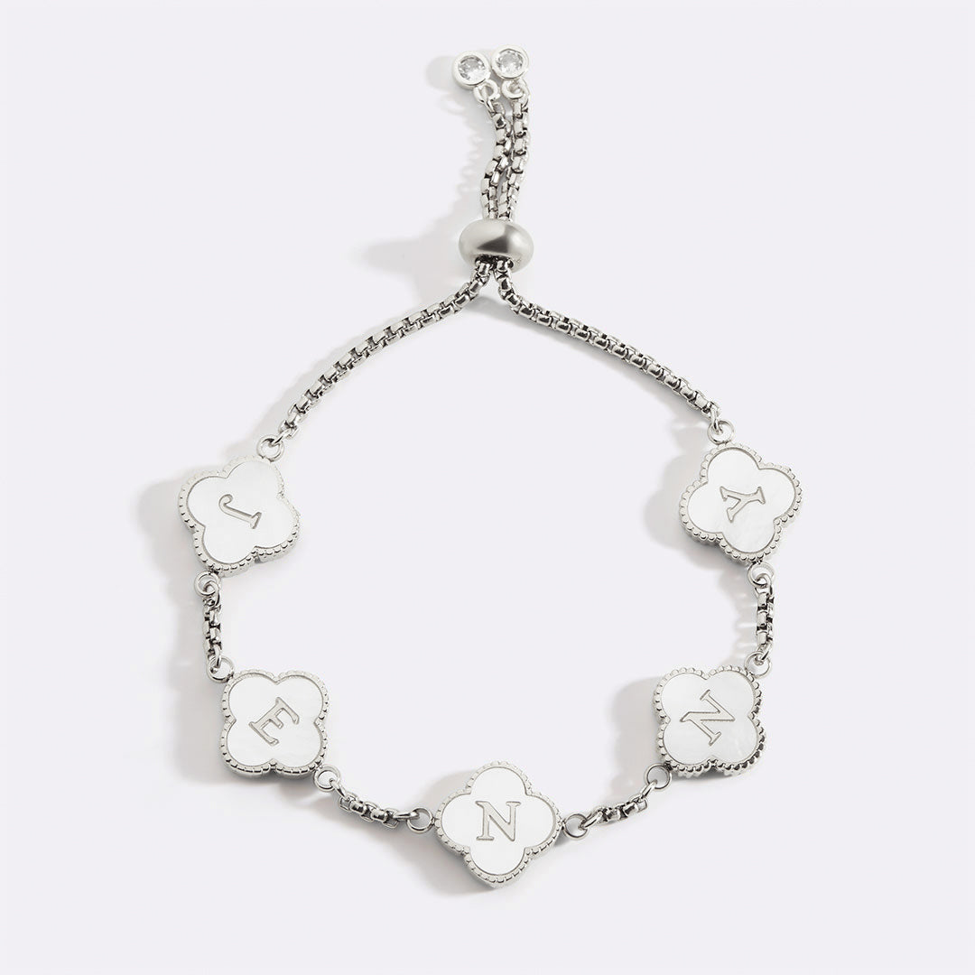 Celebrate uniqueness with the Clover Custom Name Bracelet. This charming piece features individual letters displayed on Mother of Pearl clovers, allowing you to spell out a name or meaningful word. Its playful design makes it a perfect gift for someone special or a fun addition to your own accessory collection. Add a touch of whimsy and personalization to your style!