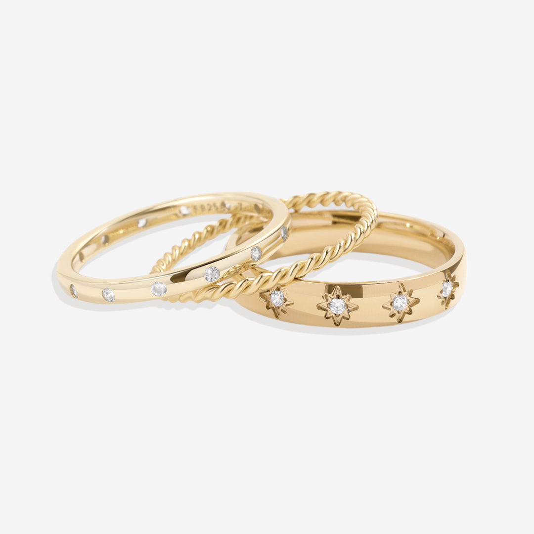 Elevate your style with the Cosmic Stacking Ring Set. A blend of celestial-inspired designs that shine together or solo, bringing a touch of the universe to your everyday look. Perfectly versatile, endlessly chic.