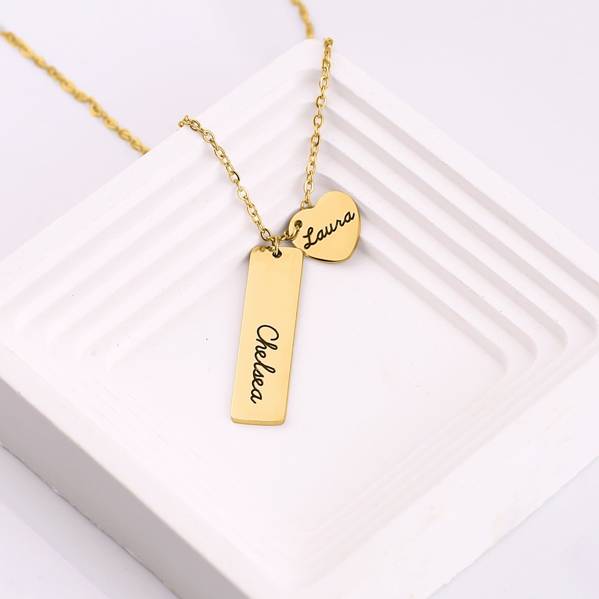 Seal your friendship and put the day you met, along with both of your names on this Custom Engraved Best Friends Necklace. Add up to six hearts or bars with your names, special dates, or meaningful phrases.