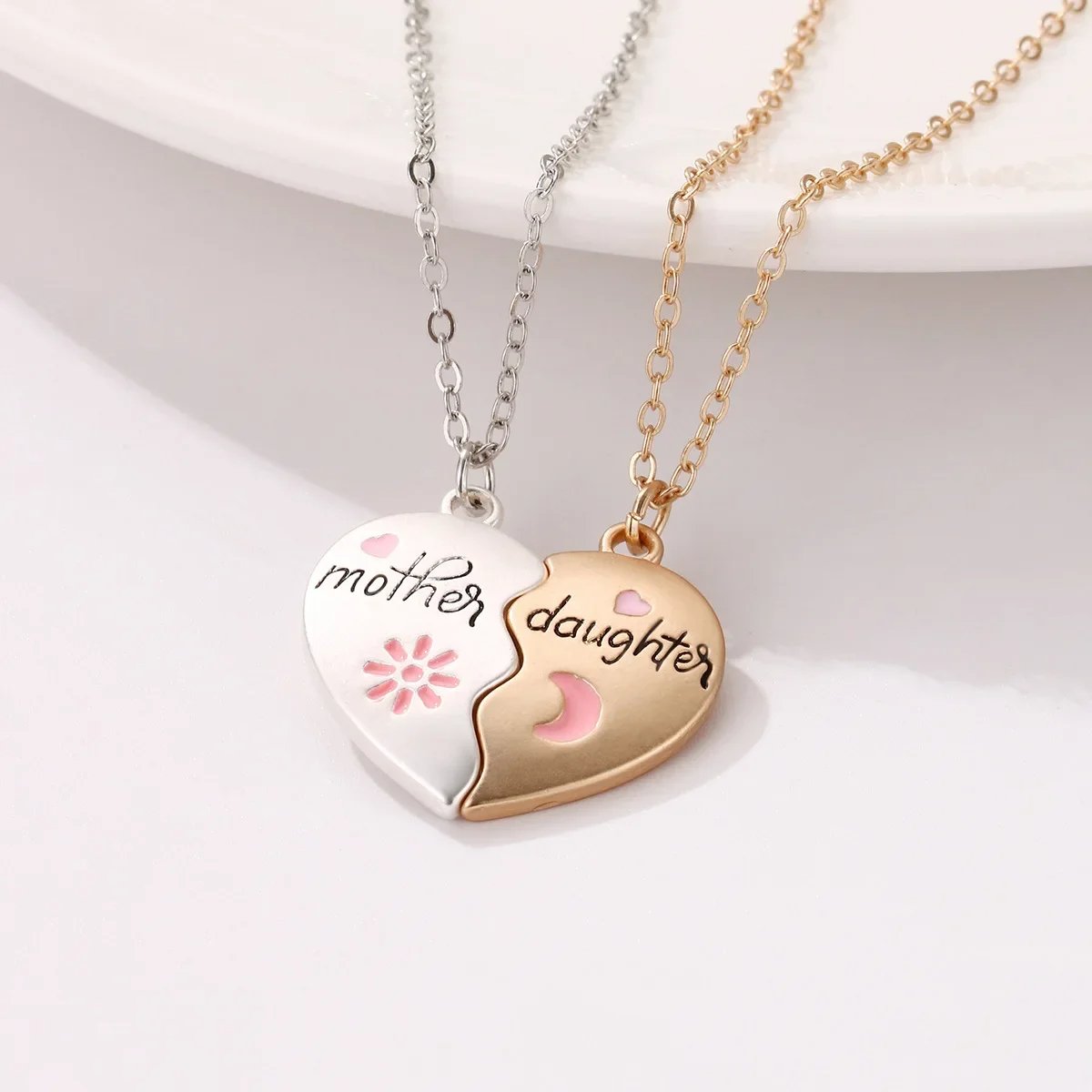 "Each necklace features a charming heart pendant, intricately engraved with the words "Mother" and "Daughter." These inscriptions serve as a sweet and silent way to say "I love you," making it a heartfelt gift that speaks volumes. Every glance at the pendant will remind you both of the special bond you share, no matter where life takes you."