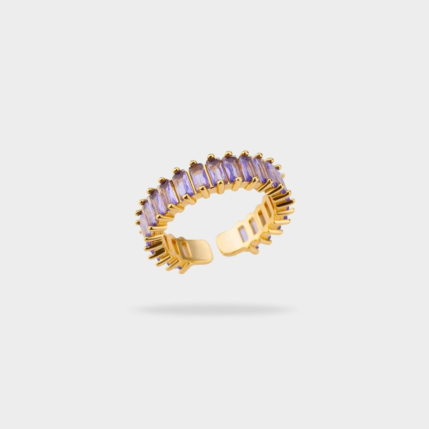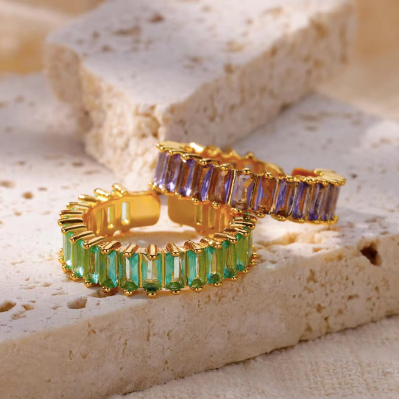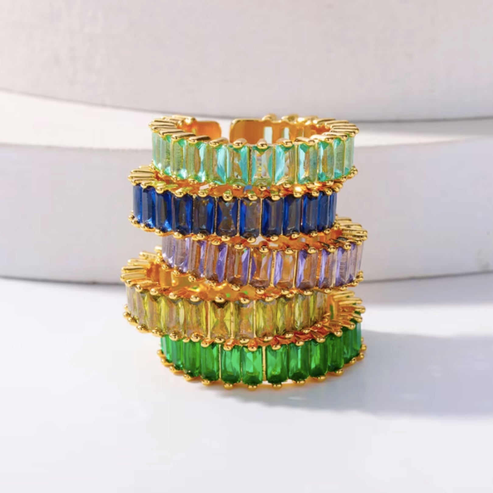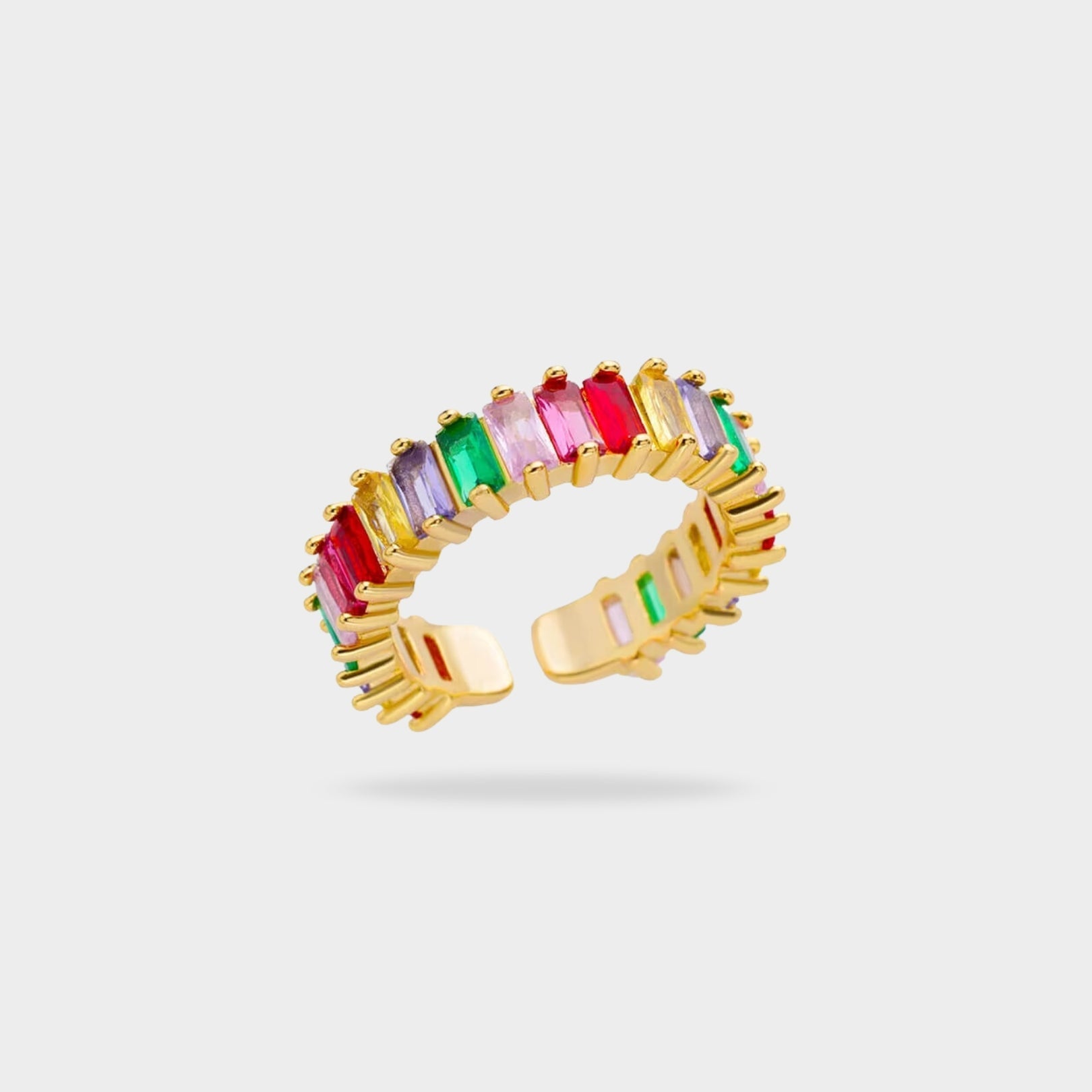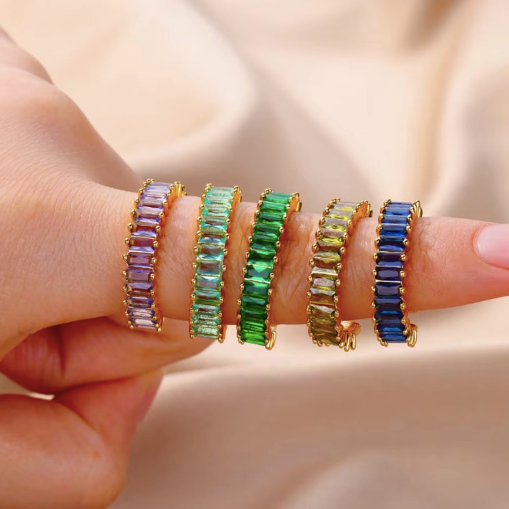 Set in a polished gold-plated band, each meticulously arranged stone sparkles brilliantly, making this eternity ring an eye-catching statement piece. The bold, symmetrical design offers endless versatility, perfect for stacking with other rings or wearing solo to let its vibrant colors shine.