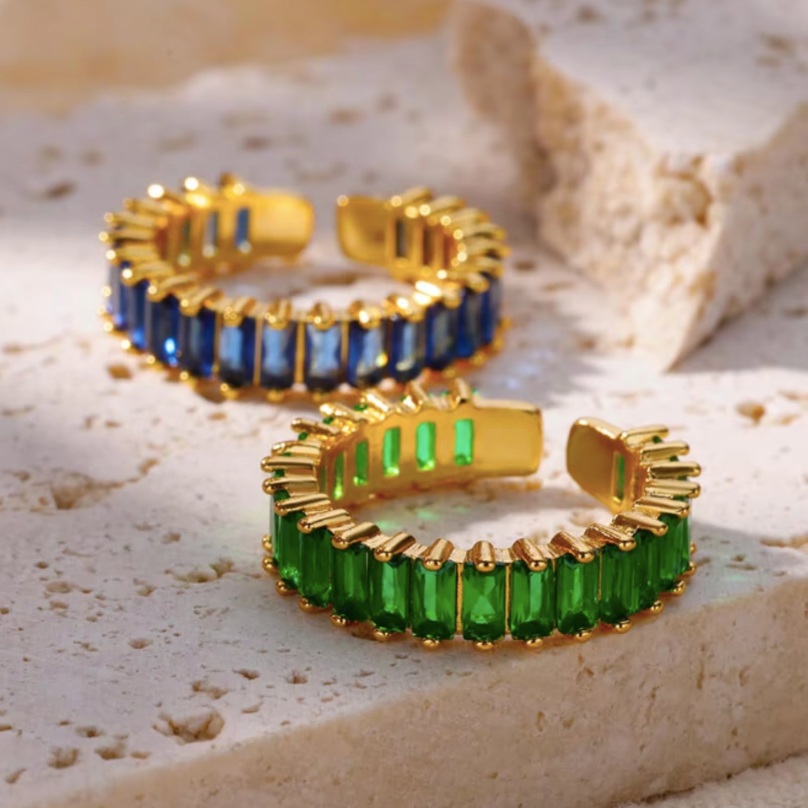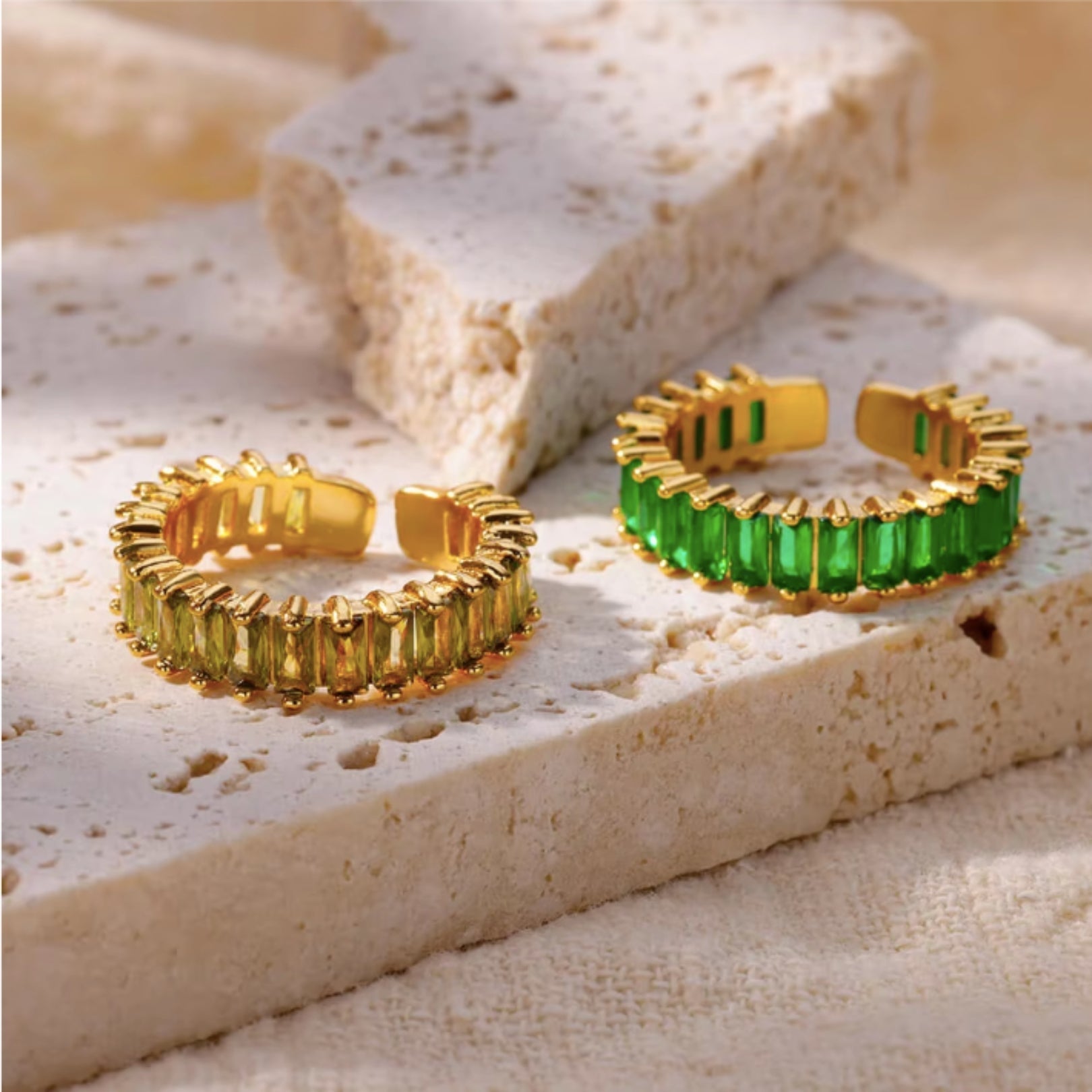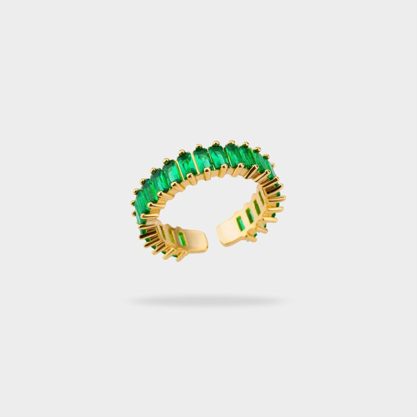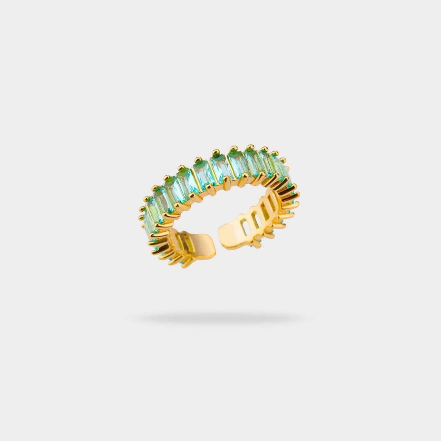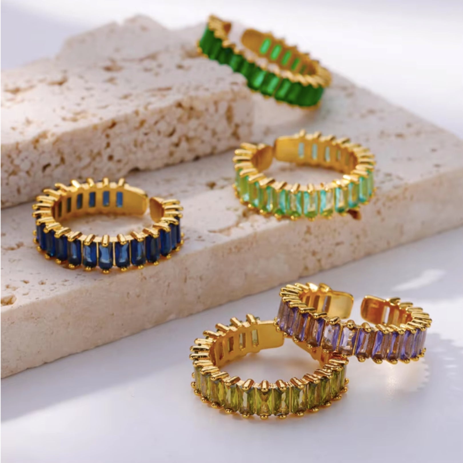 Set in a polished gold-plated band, each meticulously arranged stone sparkles brilliantly, making this eternity ring an eye-catching statement piece. The bold, symmetrical design offers endless versatility, perfect for stacking with other rings or wearing solo to let its vibrant colors shine.