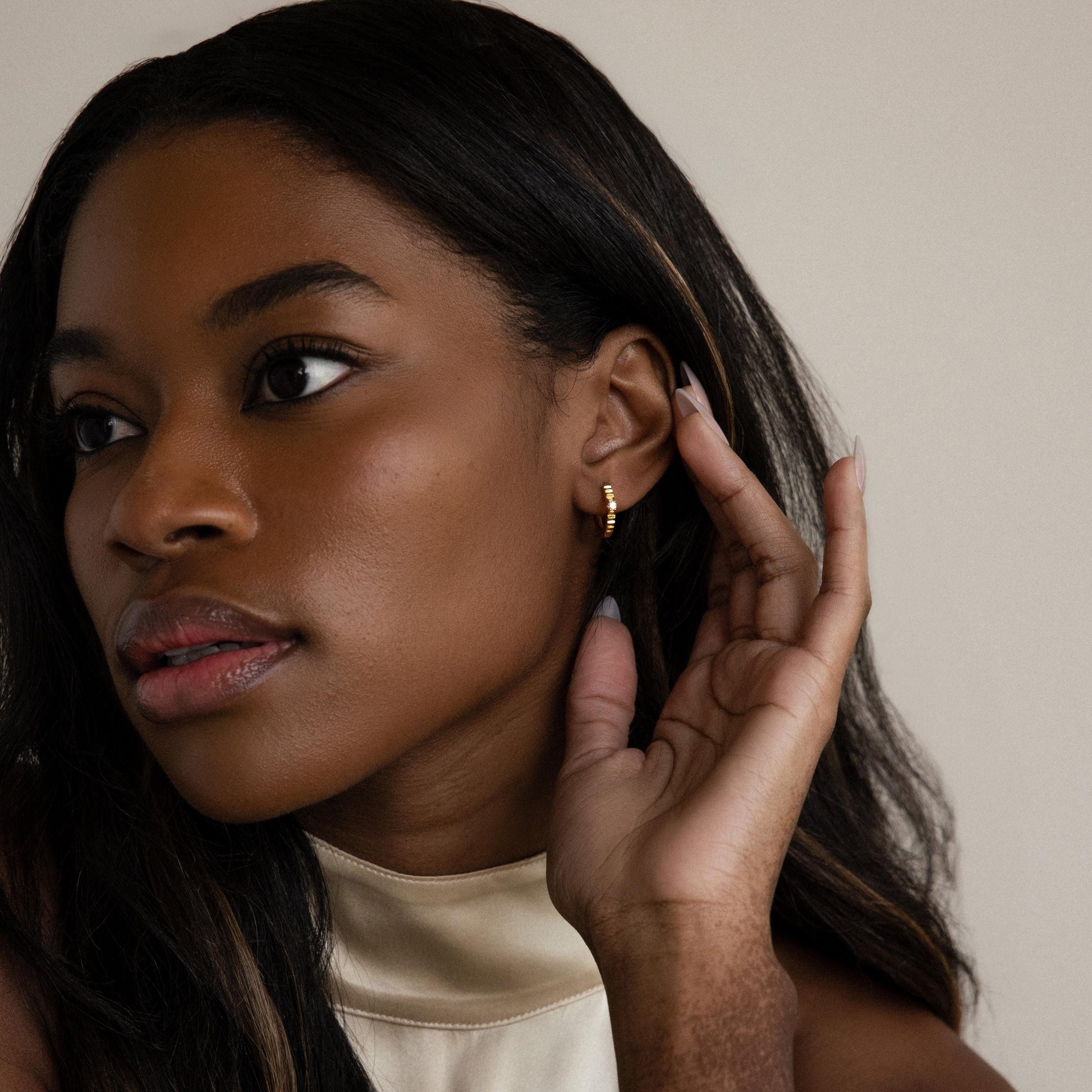 Model showcases a modern, glimmering look featuring our Ribbed Huggies, Ribbed Signet Birthstone Ring, Cecilia Pave Ring, and Pave Triple Birthstone Ring.