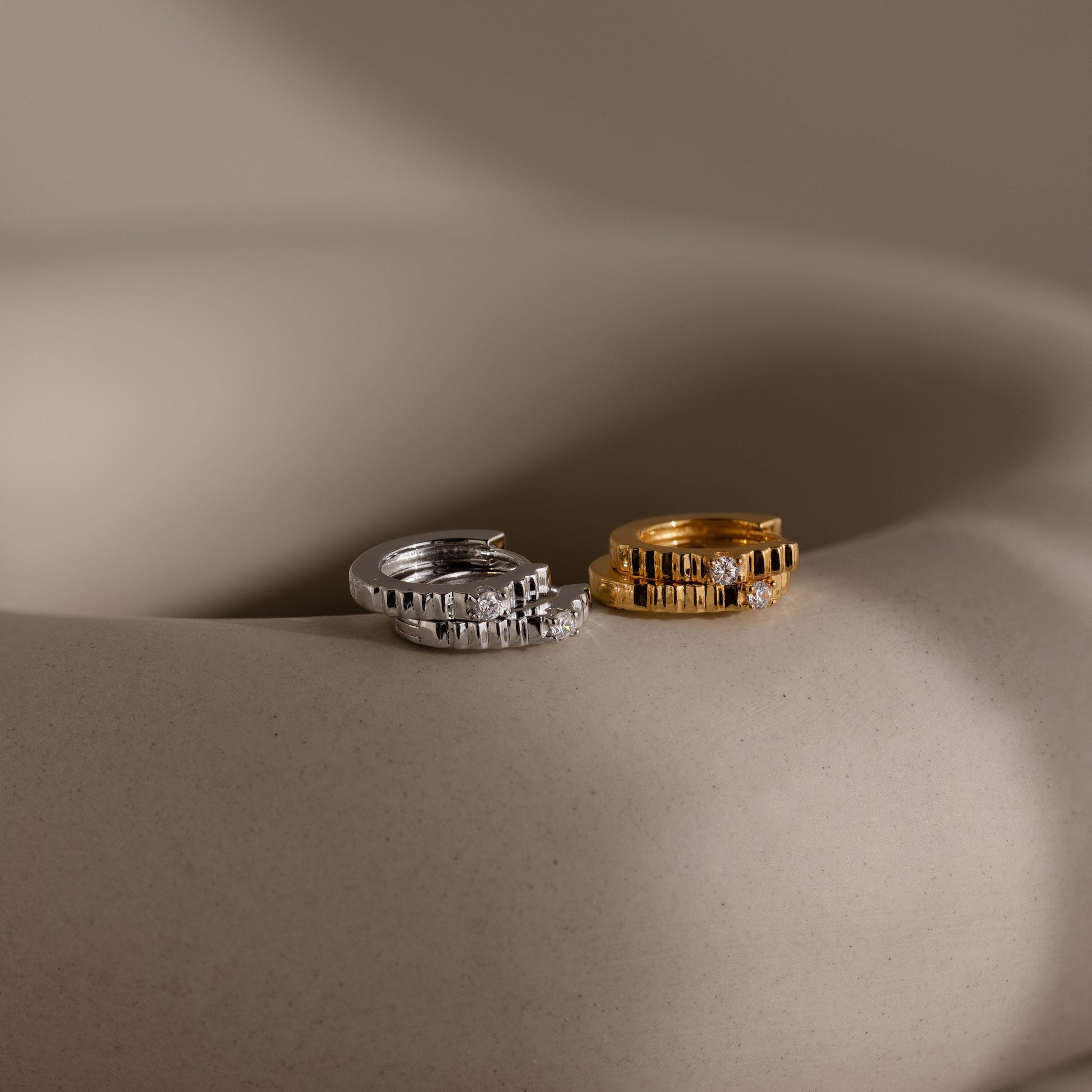 Our Diamond Ribbed Huggies are the perfect blend of subtle elegance and luxury. Featuring a ribbed design with a diamond at the center, these dainty hoops add a touch just the right amount of brilliance to any look ✨