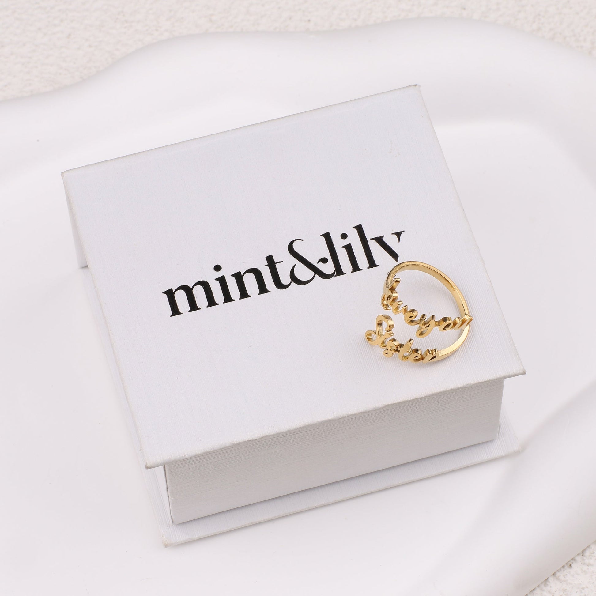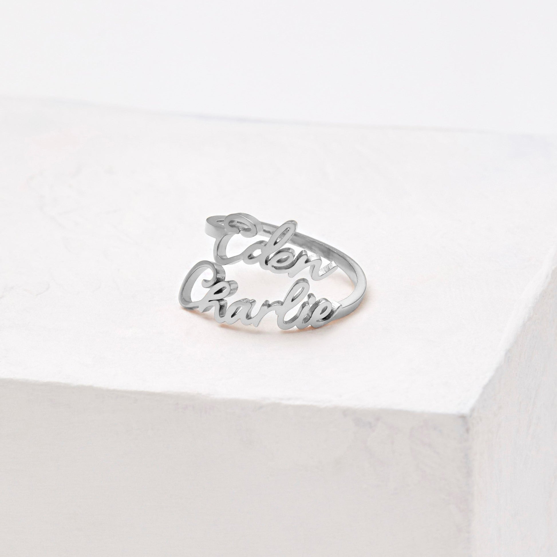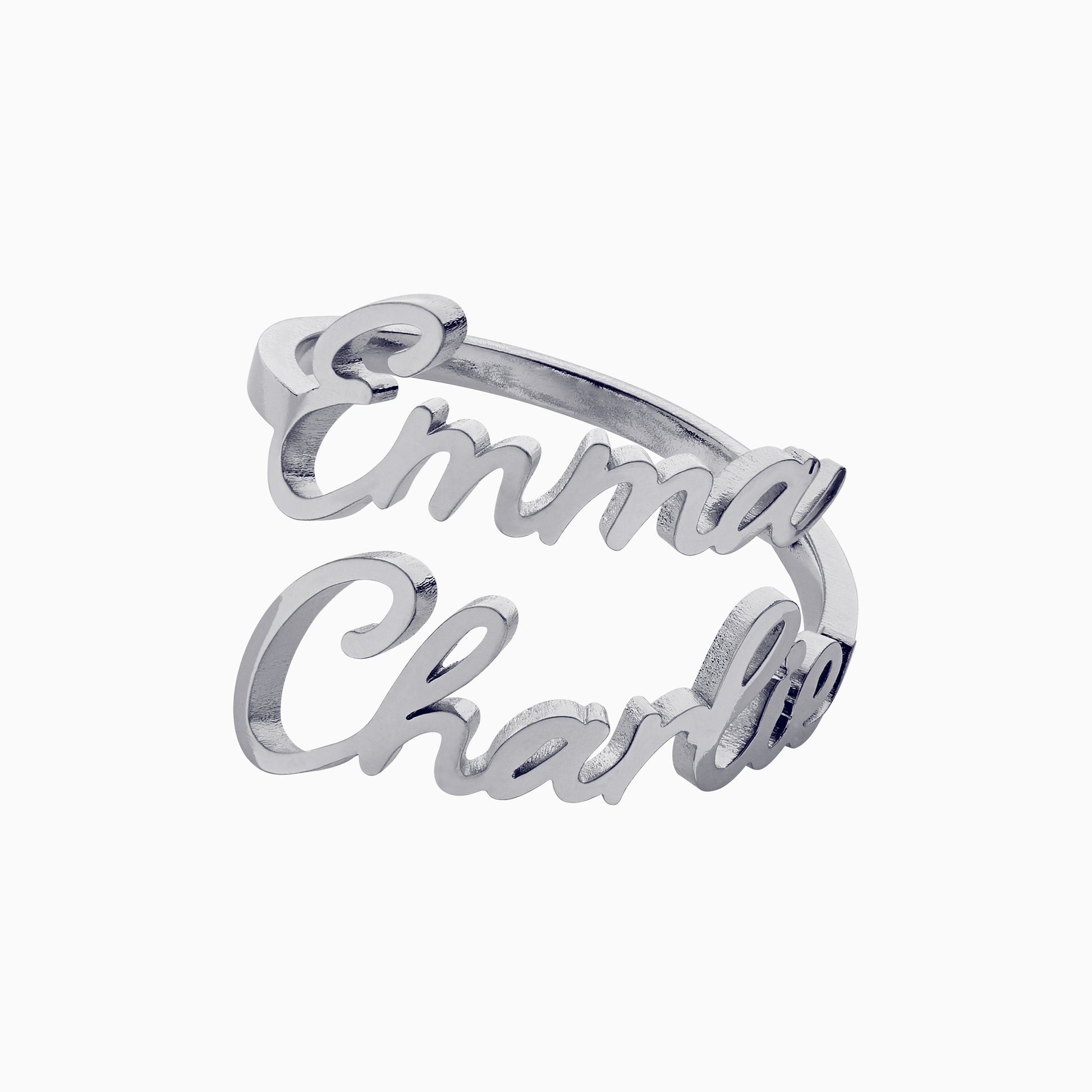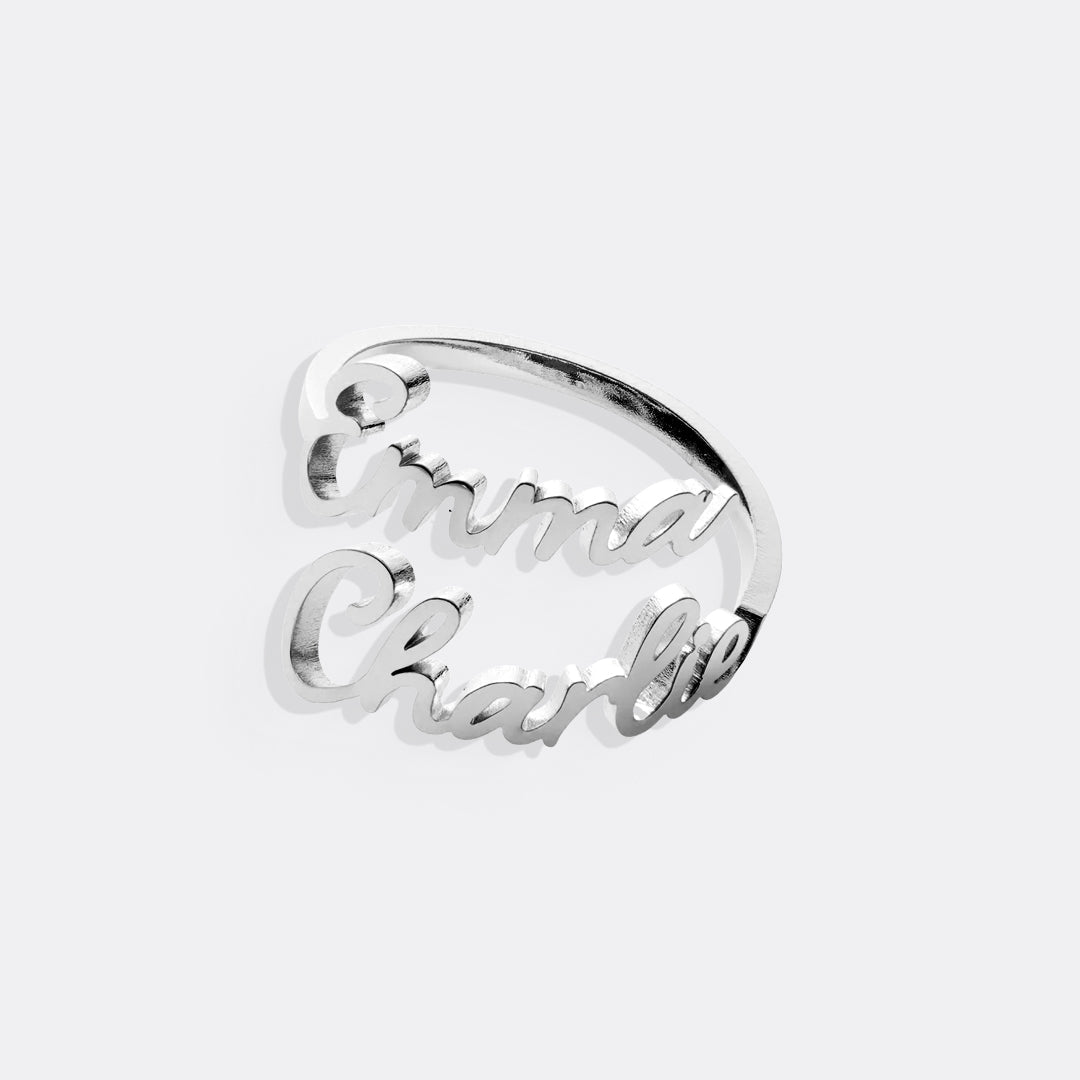 Customize this adjustable ring with a pair of special names! The open style makes for a stunning standalone piece while leaving a little wiggle room if your finger is in between sizes.