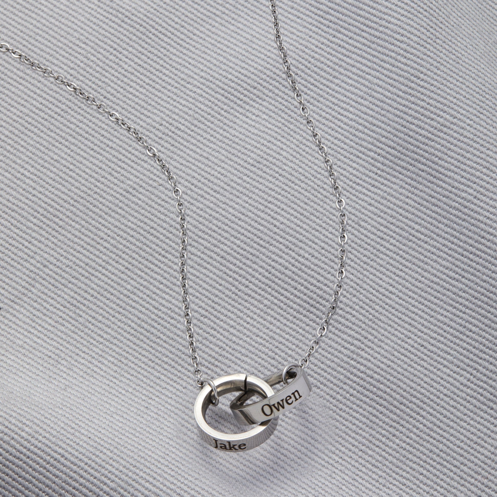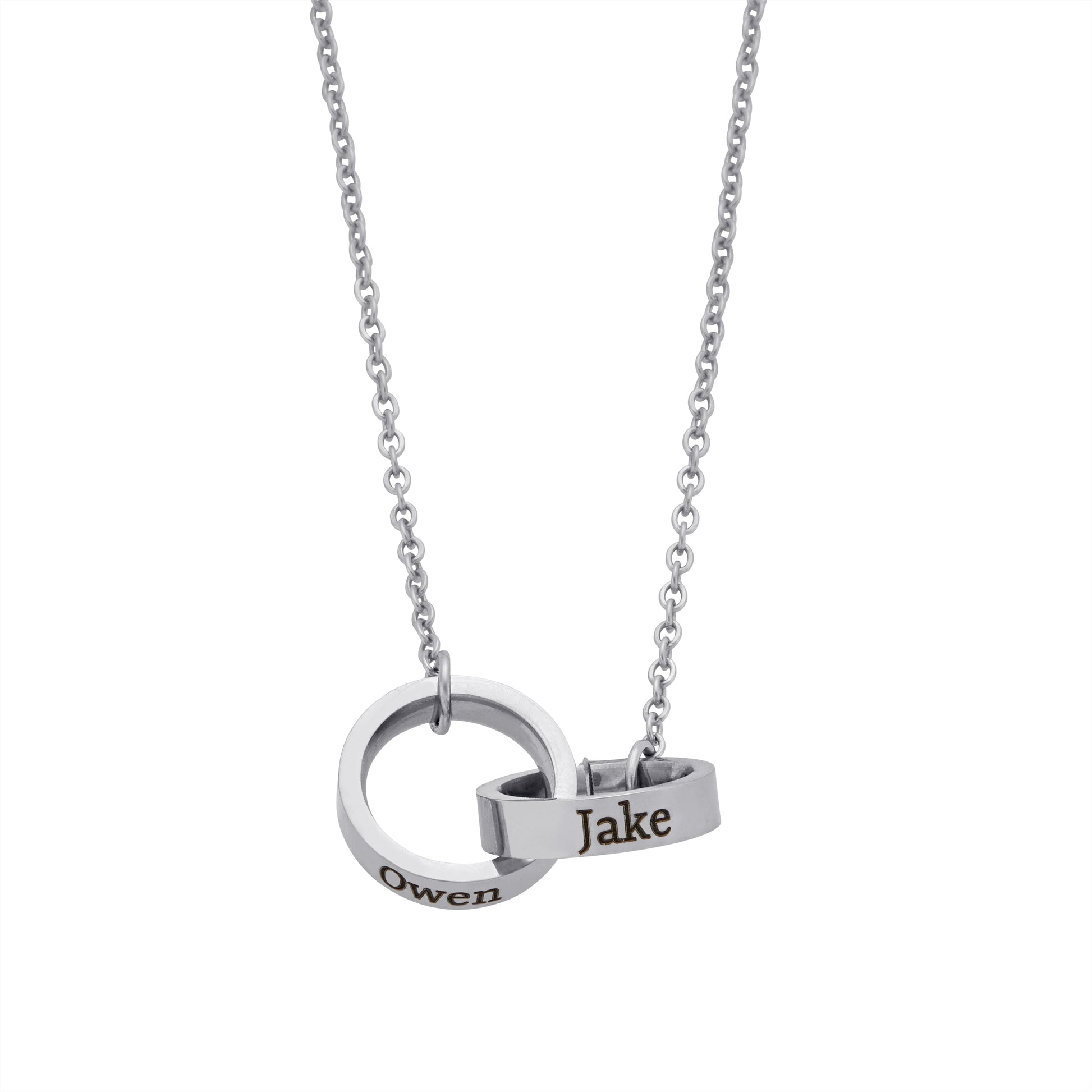 This two-ring design necklace lets you personalized two (2) different names you love and hold them close to your heart.