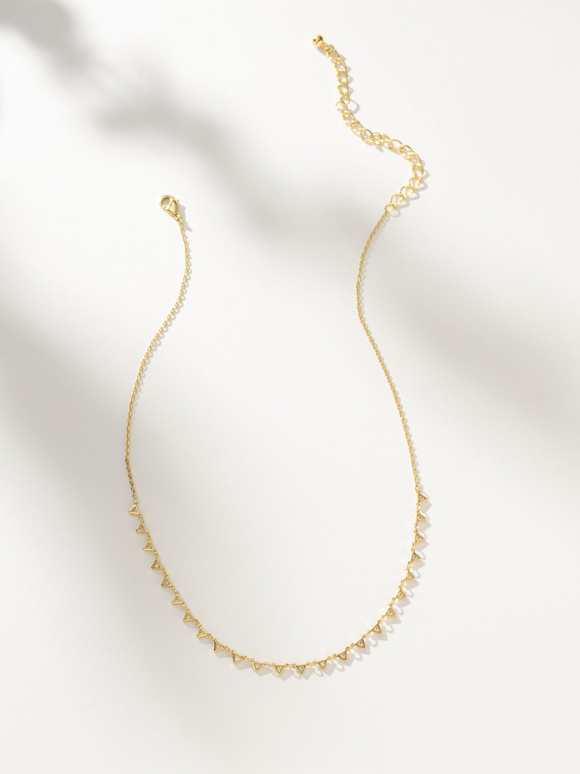 Date night and girls’ night is done right with this simple gold necklace. The East Village Necklace is the perfect touch to dress up any outfit and it can be layered with other necklaces for a dramatic look. Add our best selling mini triangle necklace to your everyday jewelry collection.