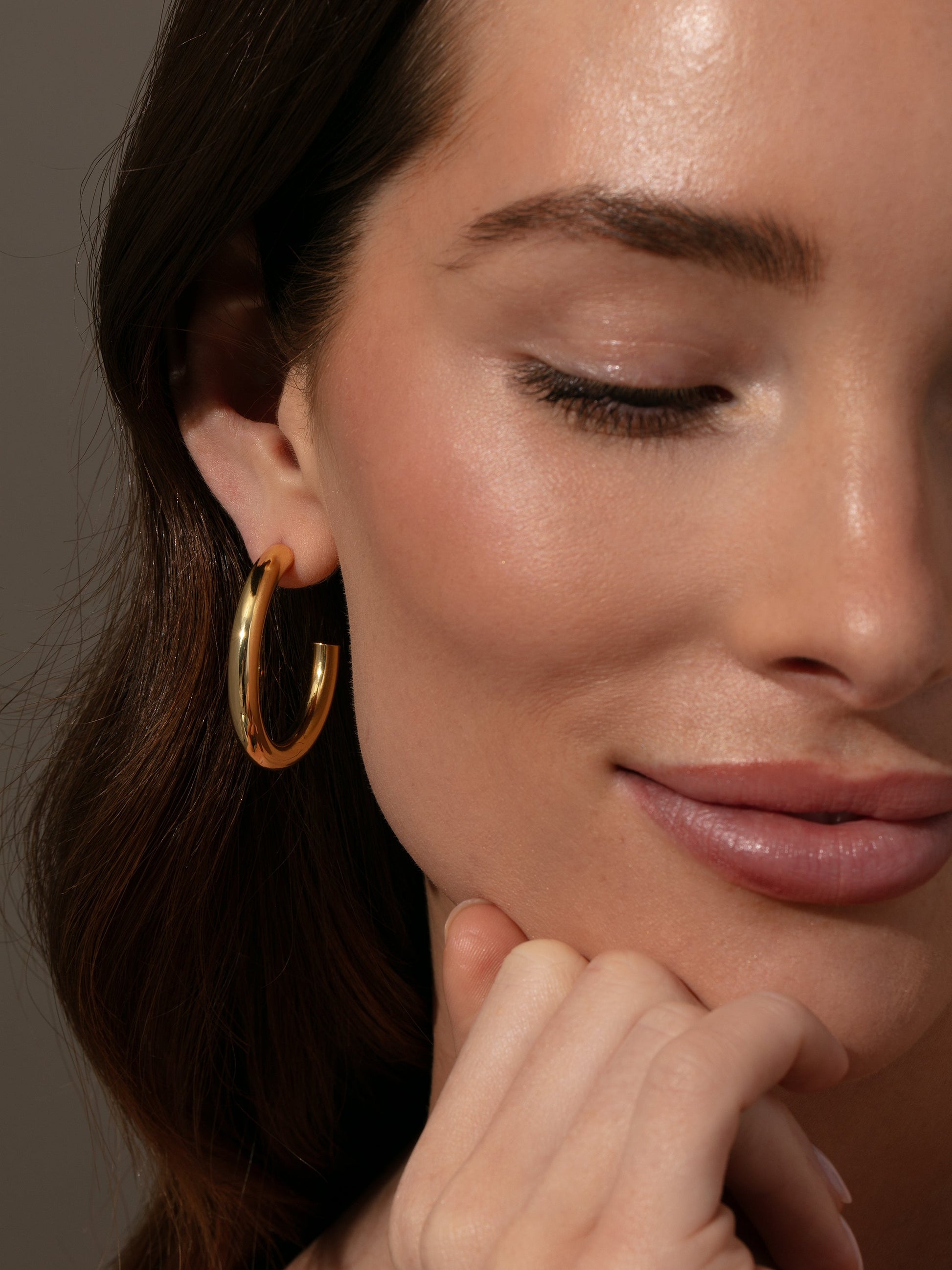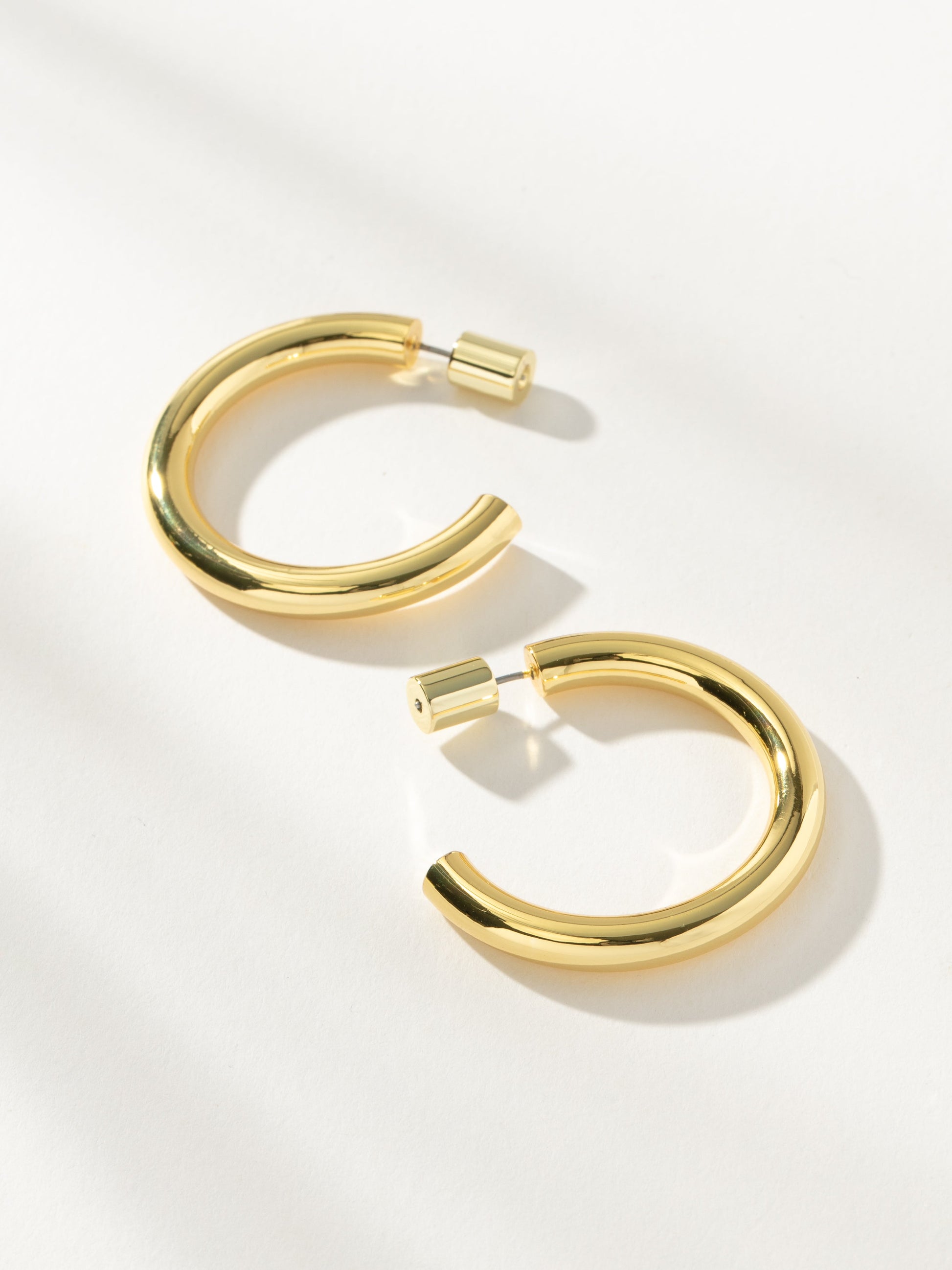 Nothing is more classic than a pair of Effortless Tube Hoop Earrings. Coming in gold and silver, these hoop earrings are sure to go with everything in your closet and your jewelry collection. For a unique look, we made a special backing that looks like the hoop is continuing even behind your ear. Create an ear stack by pairing these tube hoops with any of our hoops and huggies.