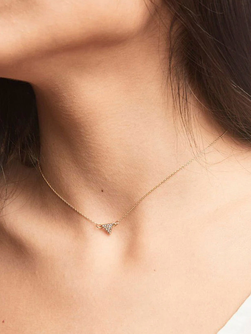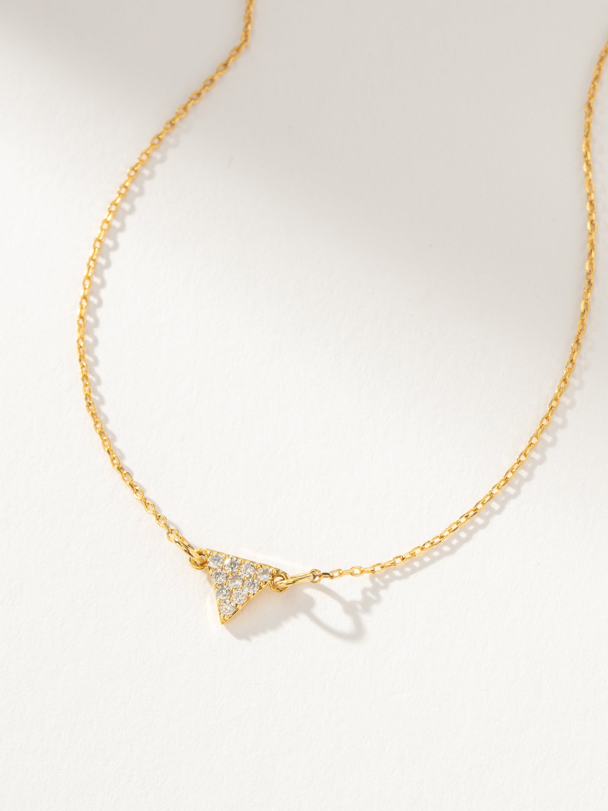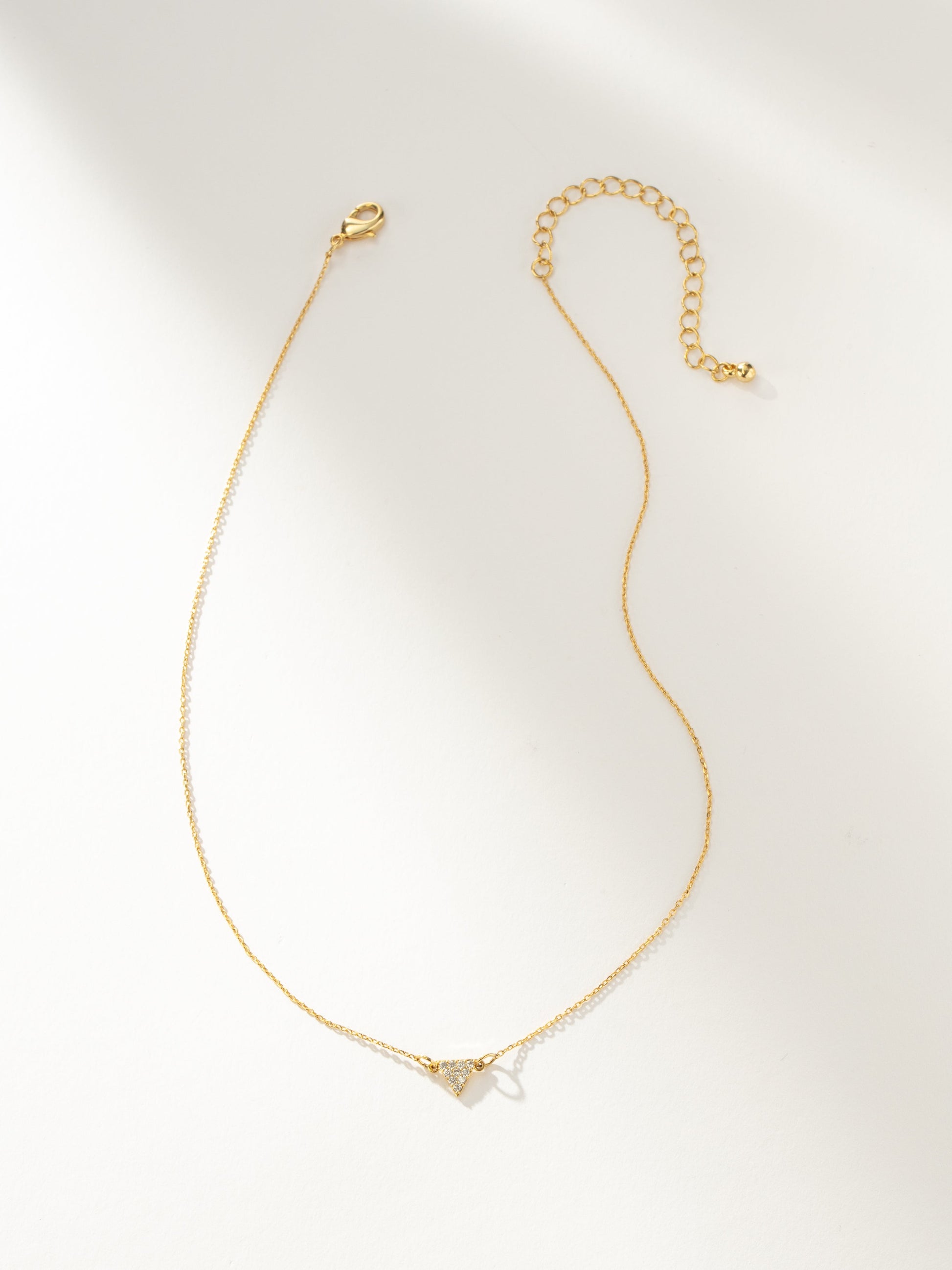 Add a touch of sparkle to your necklace stack with our Gulch Necklace. This gold necklace brings a geometric design to your look with a dainty chain and pavé triangle pendant. For a necklace stack everyone will be obsessed with, pair this dainty necklace with a bold statement necklace.