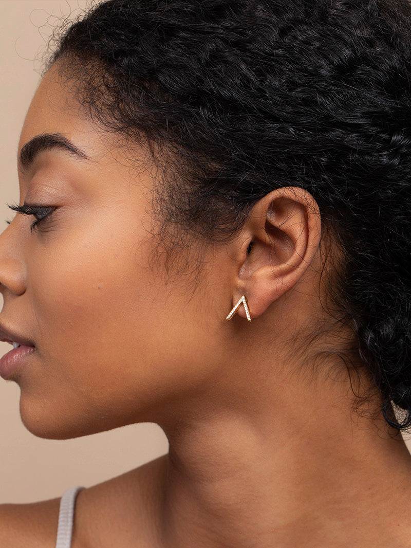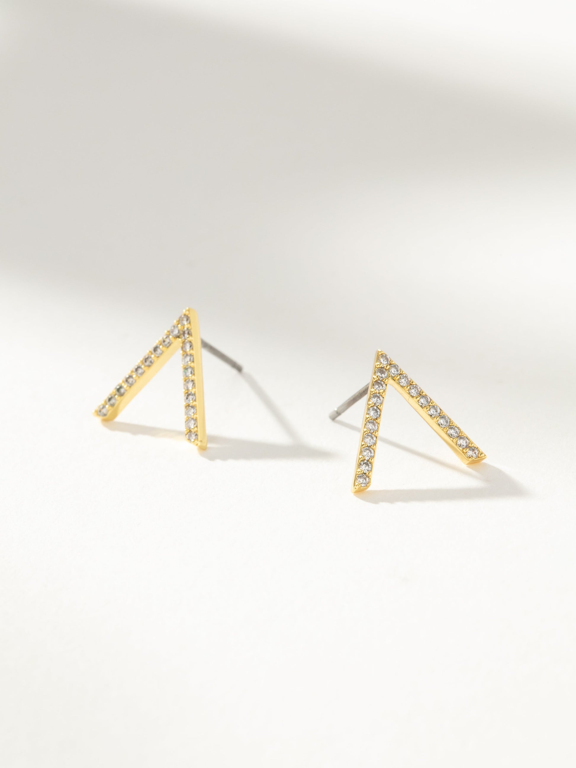 Our Little Stud Earrings are petite glam for any outfit. No matter your look, these gold stud earrings will take it to the next level with their upside down V shape and small stones down each side.