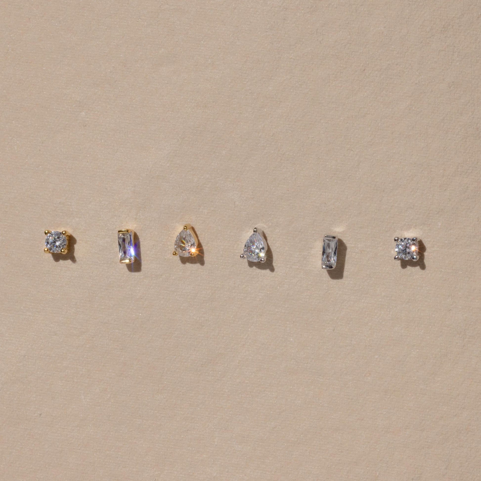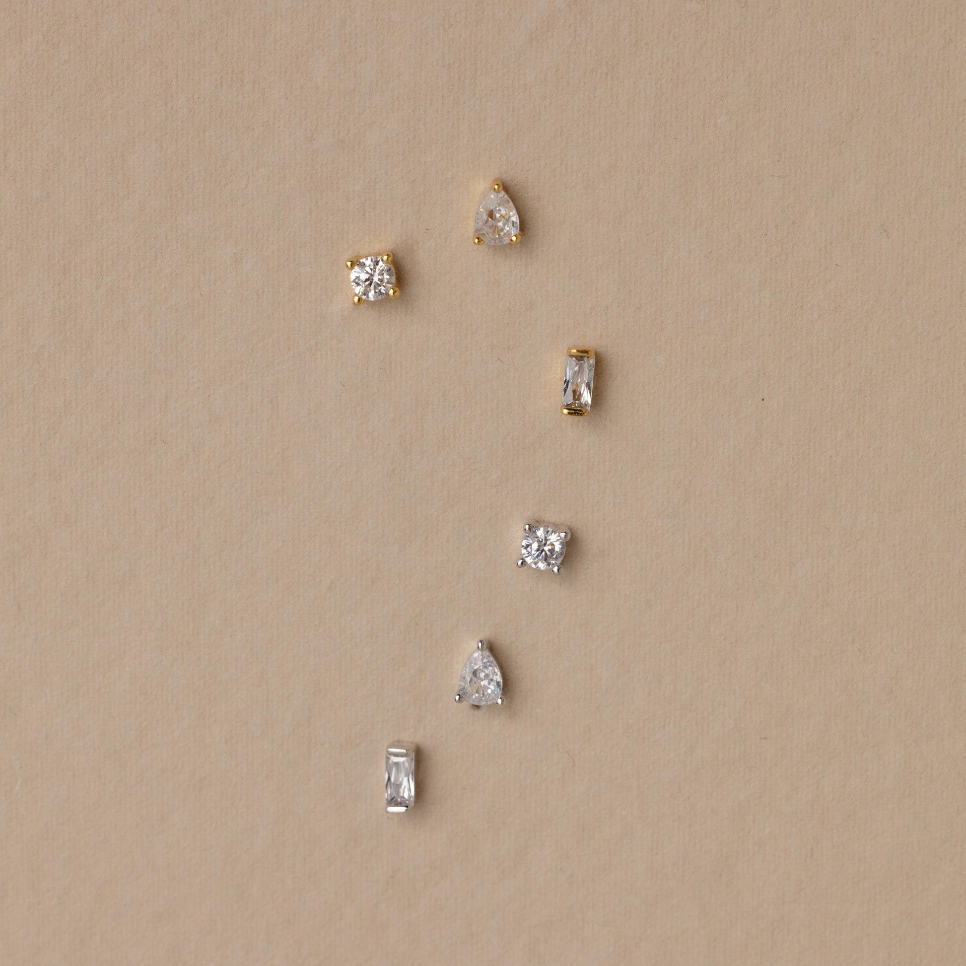 Drift into a world of dreamy elegance with our Mixed Diamond Flat Back Stud Set. Featuring round, baguette, and teardrop diamond studs, these flat-back stud earrings are perfect for adding a touch of sparkle to your best moments ✨
