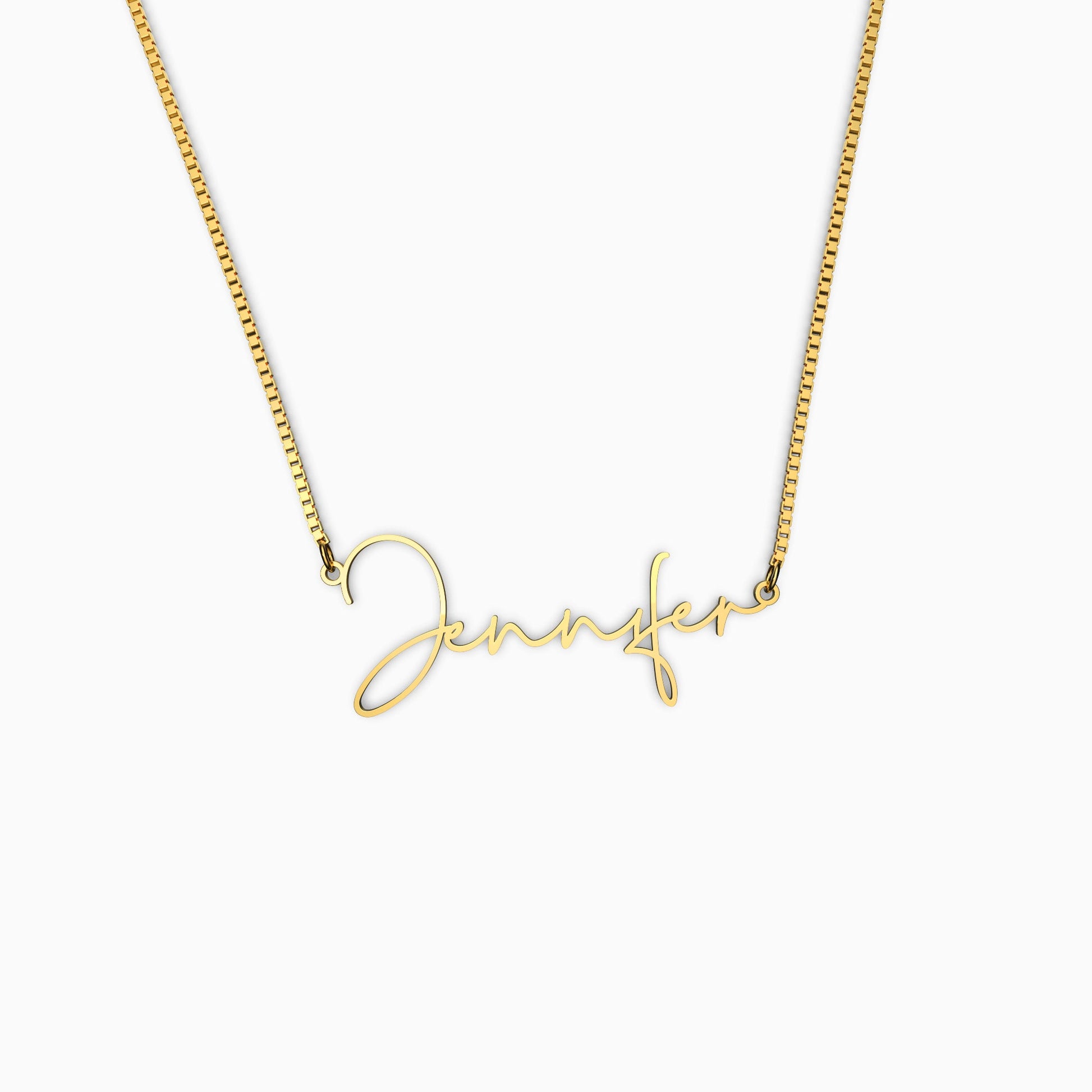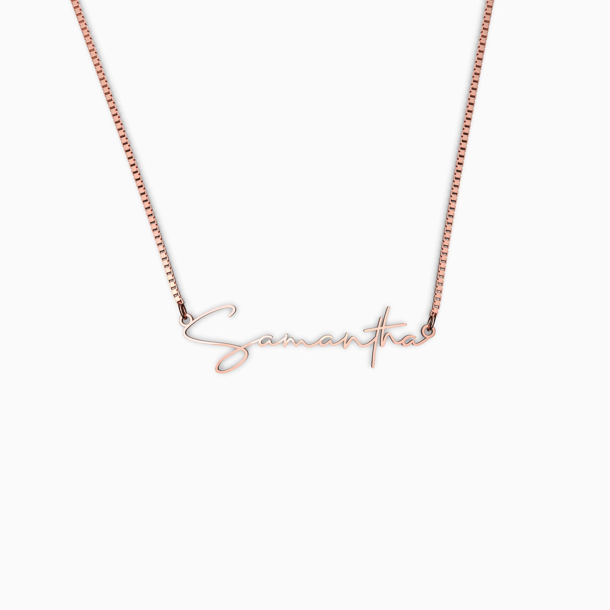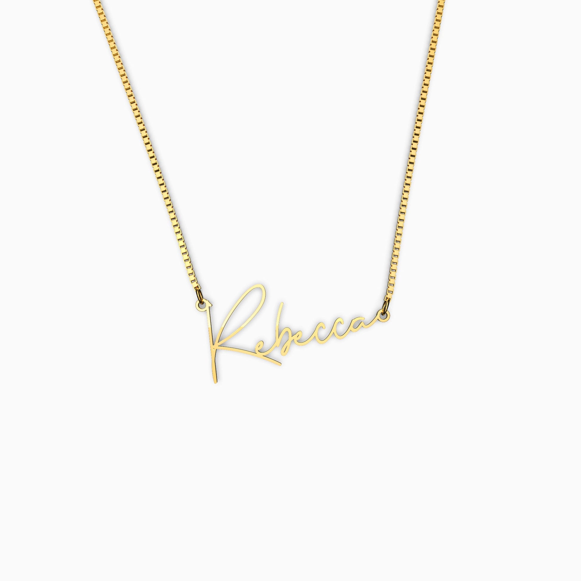 The perfect gift for any special occasion, this modern name necklace is a stylish accessory to add to your loved one's wardrobe. Crafted from 18k Gold, Rose Gold and Silver, the necklace features a unique handwriting style font, and comes with a 16" + 2" chain. The necklace is the perfect way to show your love for someone special. It is a timeless piece that will never go out of style.