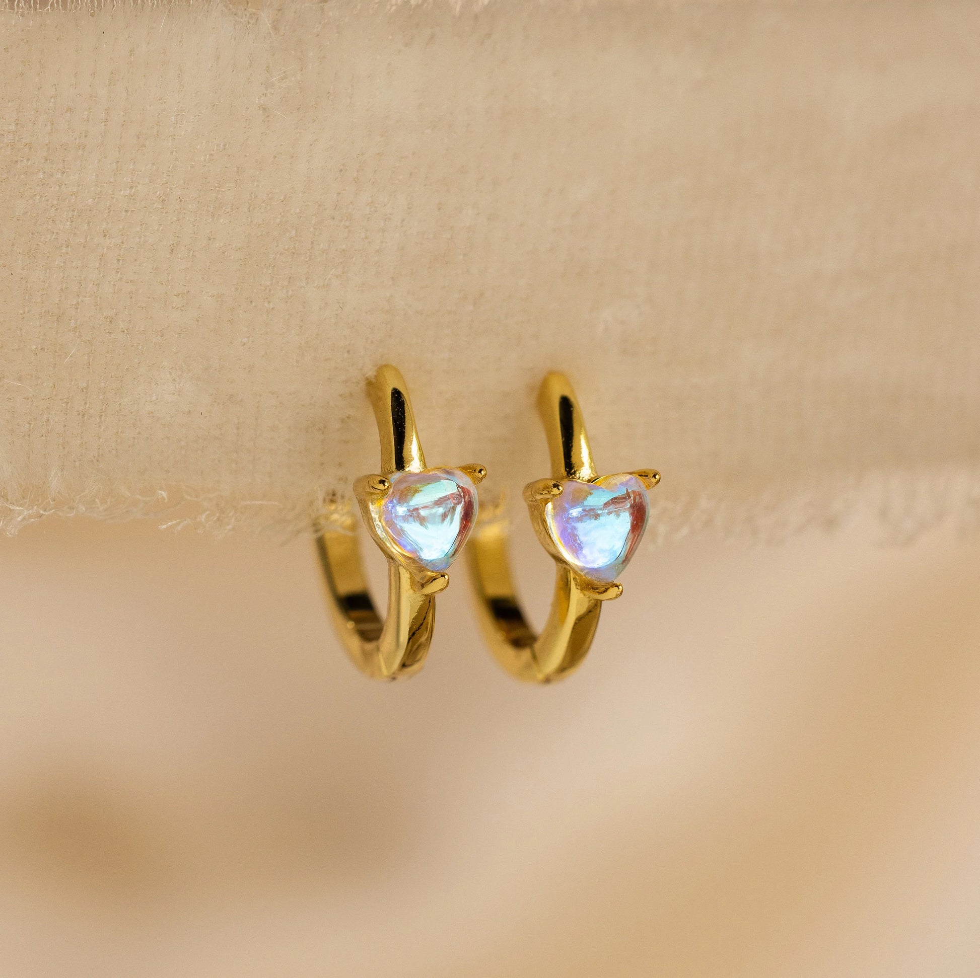 - Featuring ~1.5mm wide Huggie Hoop Earrings with a ~4mm Moonstone CZ Heart Gemstone