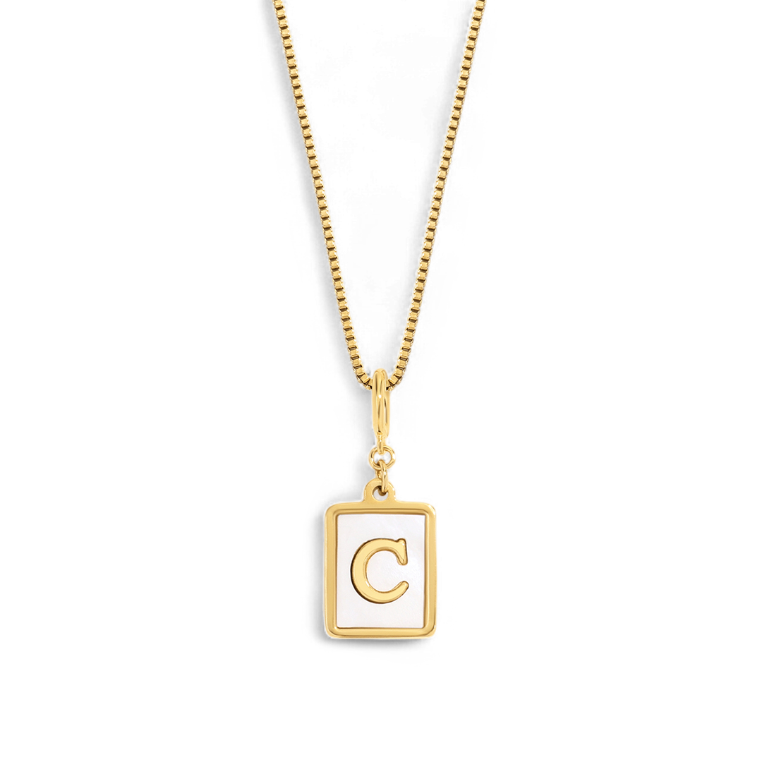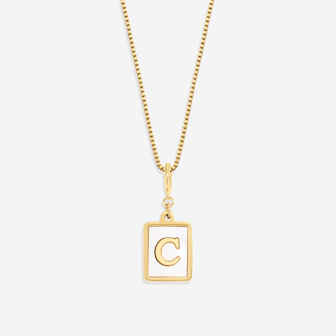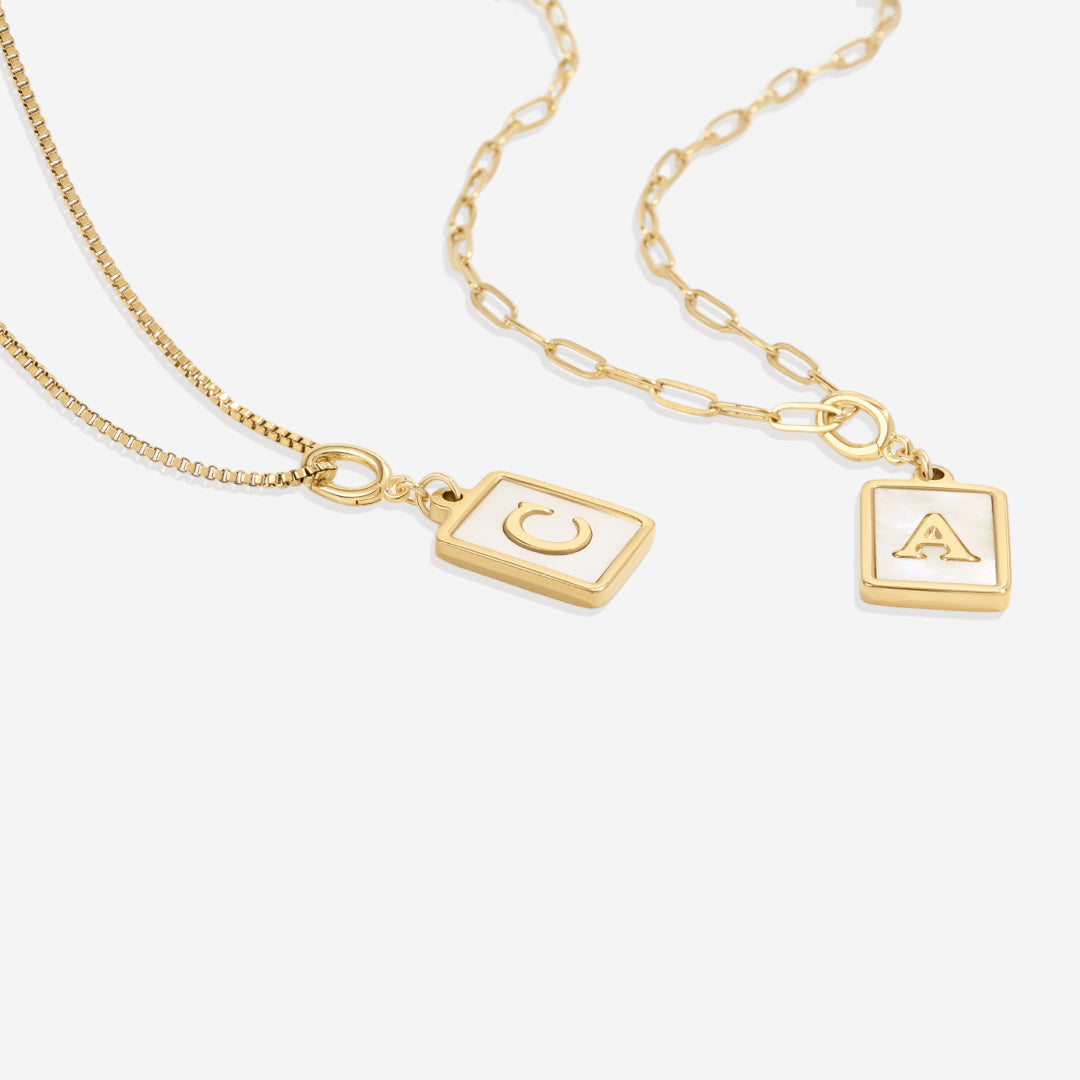 Elegant and personal. The Mother of Pearl Initial Card Necklace on a box chain adds a sleek, modern edge to its timeless charm. A perfect blend of style and sentiment for every day.