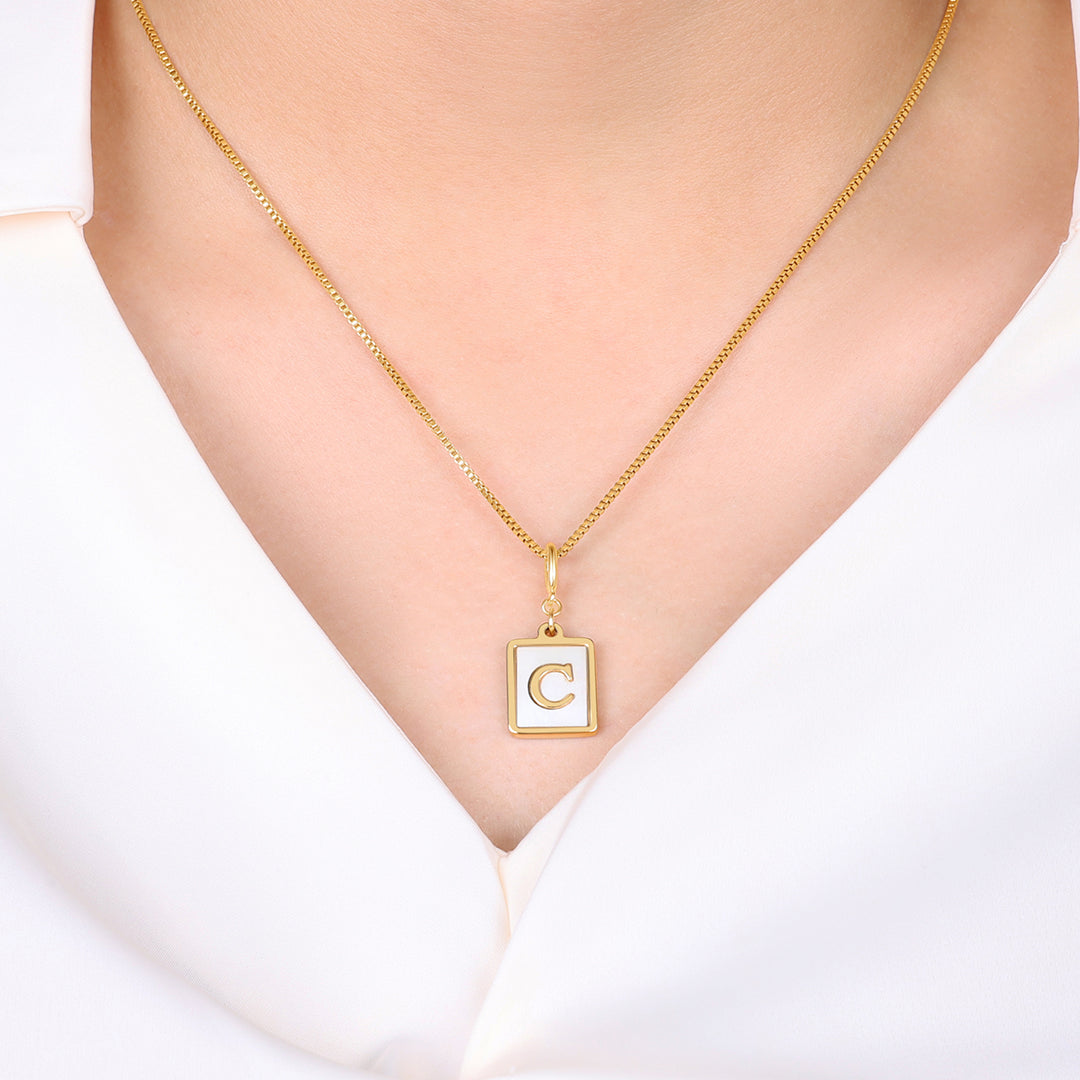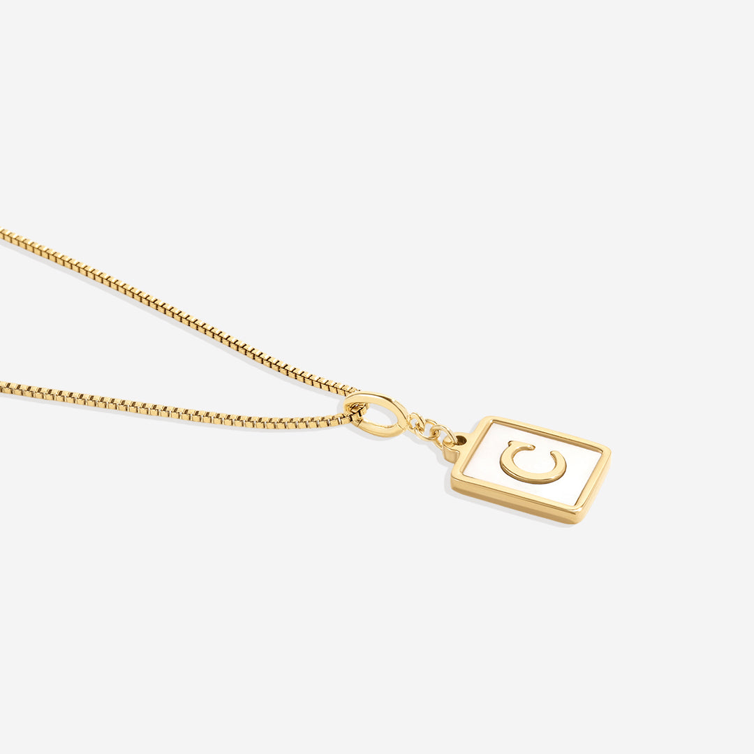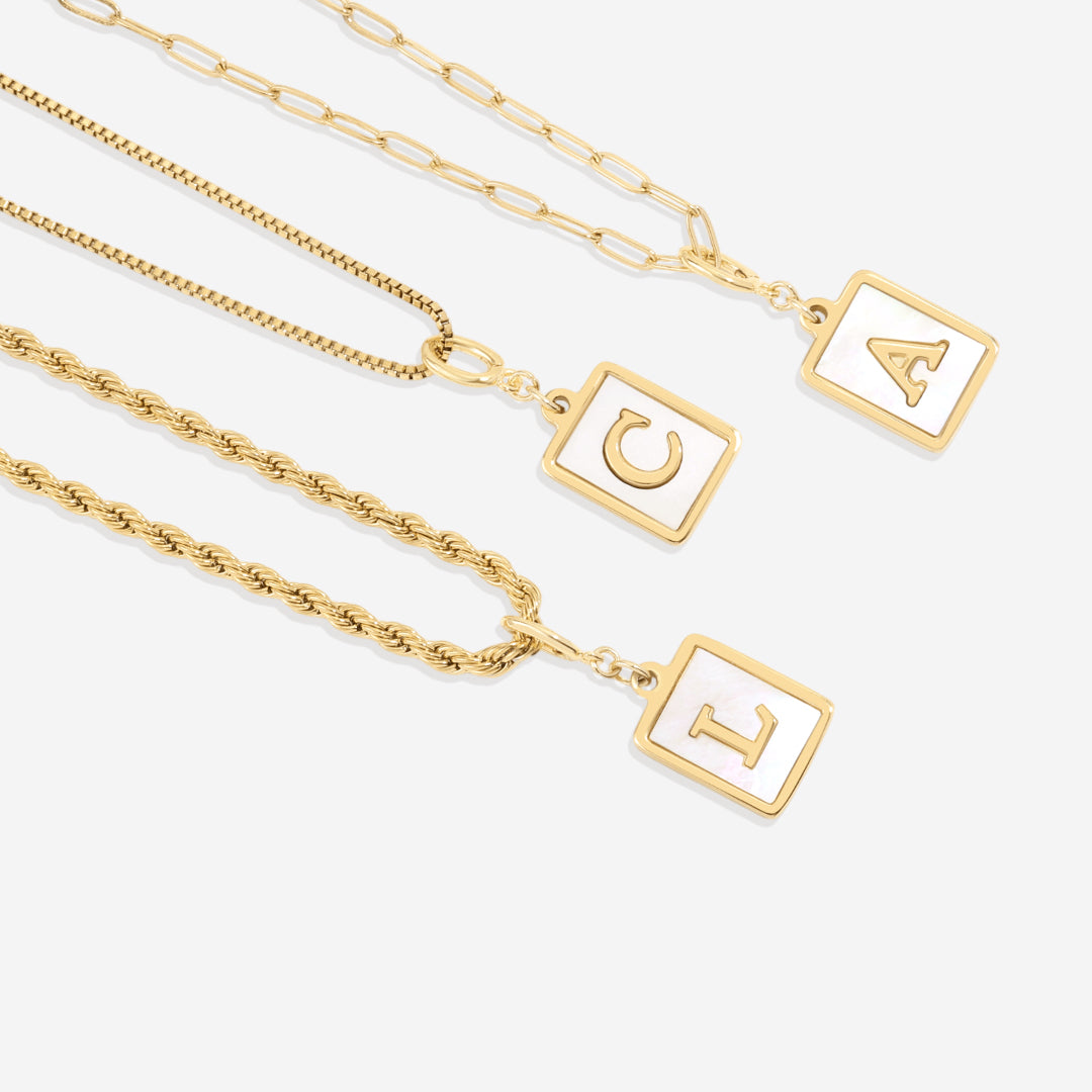 Elegant and personal. The Mother of Pearl Initial Card Necklace on a box chain adds a sleek, modern edge to its timeless charm. A perfect blend of style and sentiment for every day.