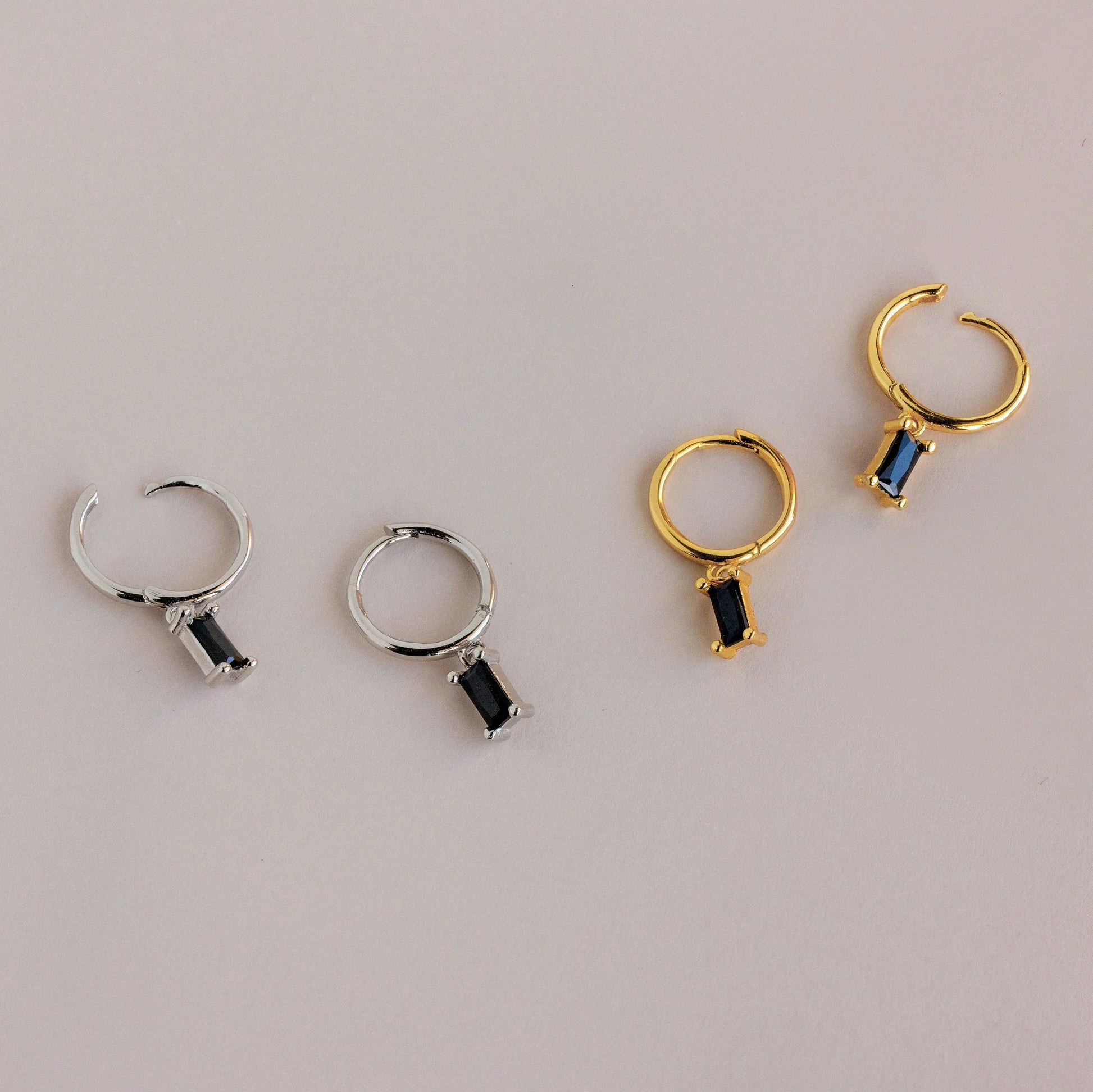 - Featuring ~1.5mm Wide Huggie Hoop Earrings with dangling ~6x4mm Baguette-Cut Onyx CZ Gemstone