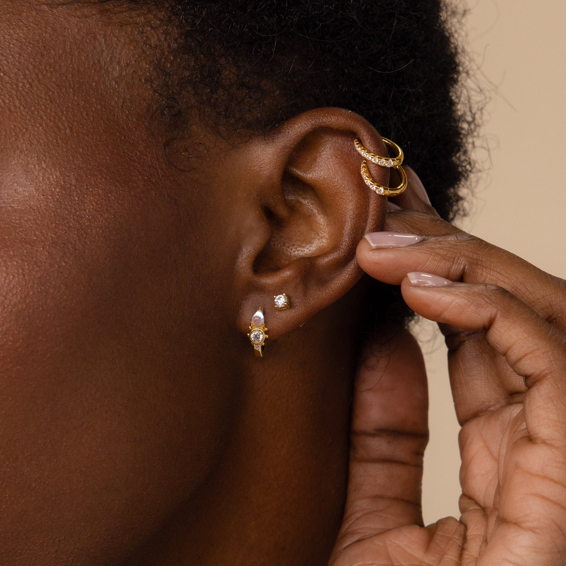Model showcases a charming & unique earring look featuring our Vera Pave Huggies and Diamond Flatback Studs.