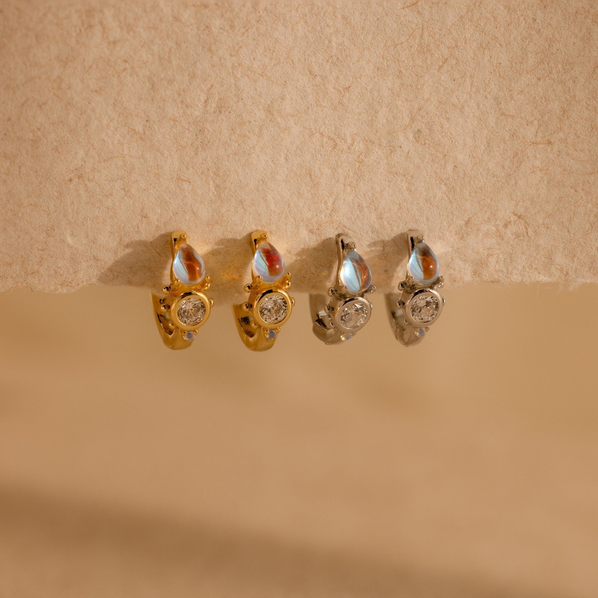 - Featuring dainty Huggie Hoop Earrings with ~4mm Teardrop Opal CZ Stone, ~3mm Bezeled Diamond CZ Stone and ~1mm Round Opal CZ Stone