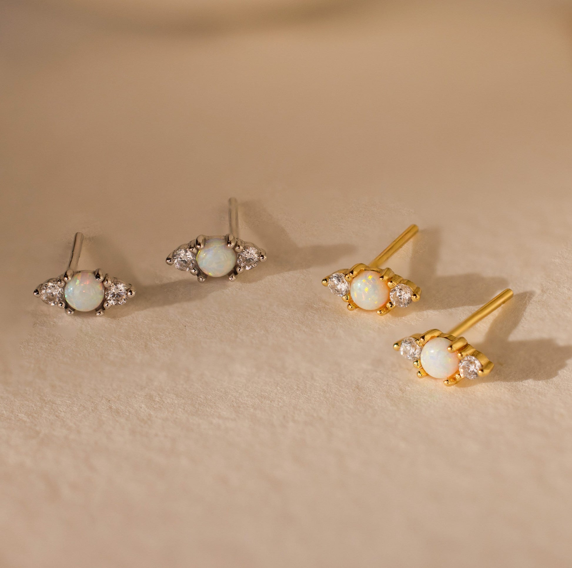 - Featuring dainty ~7.5x3.5mm Stud Earrings with ~3mm Opal CZ Gemstone and ~1.5mm Diamond CZ Gemstones