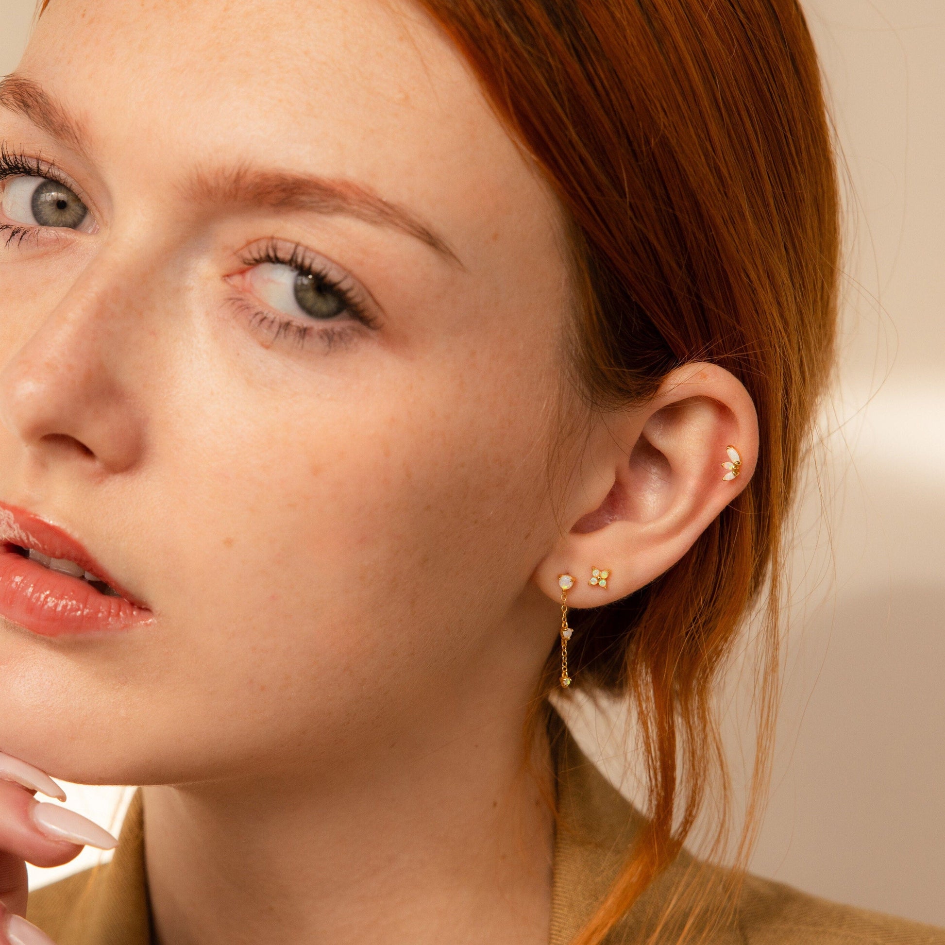 - Model showcases a delicate, opal layering look featuring our Opal Heart Studs and Opal Marquise Studs.