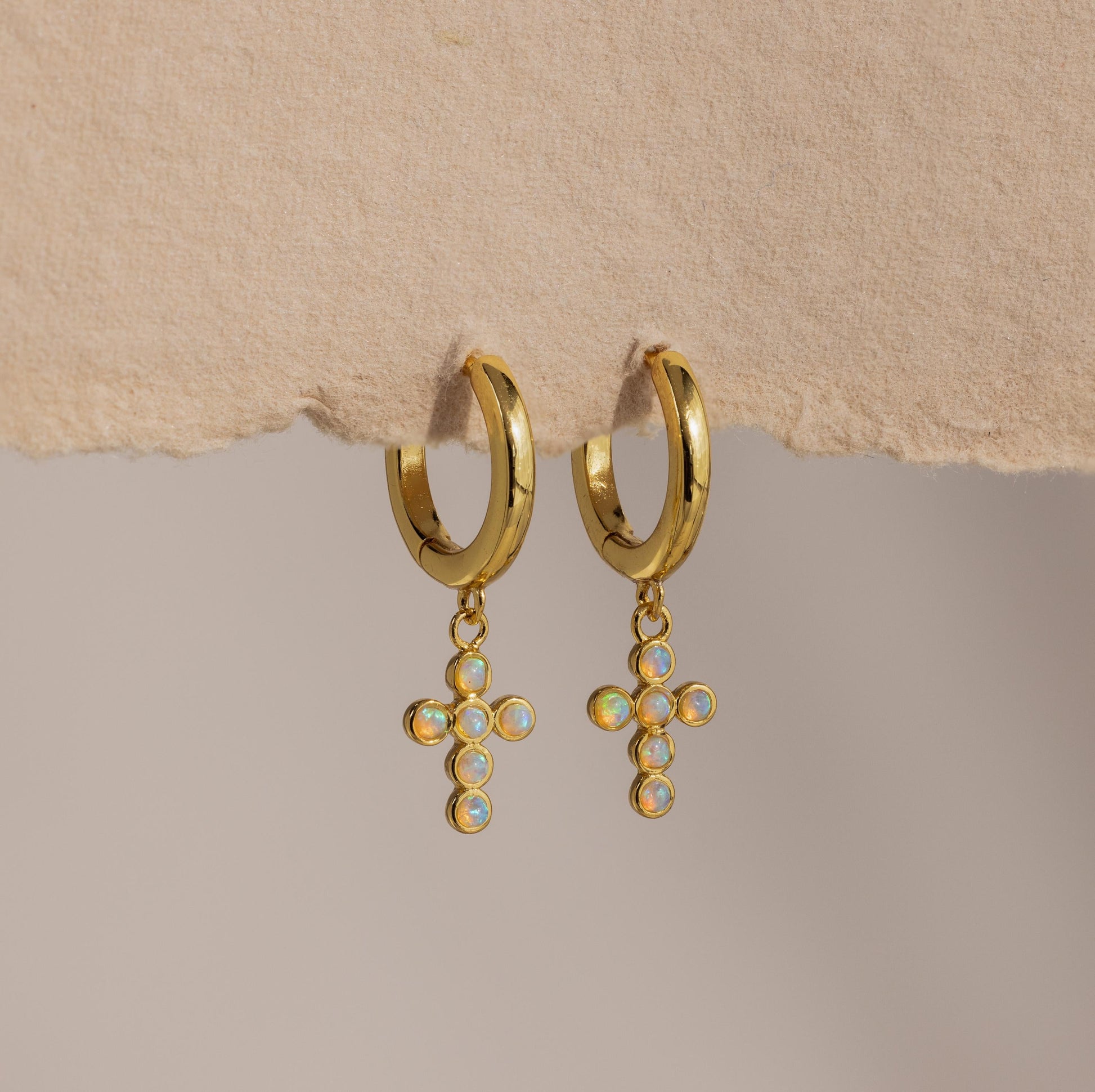 - Featuring ~2mm Opal Stones on 8mm x 6mm Dainty Cross Earrings