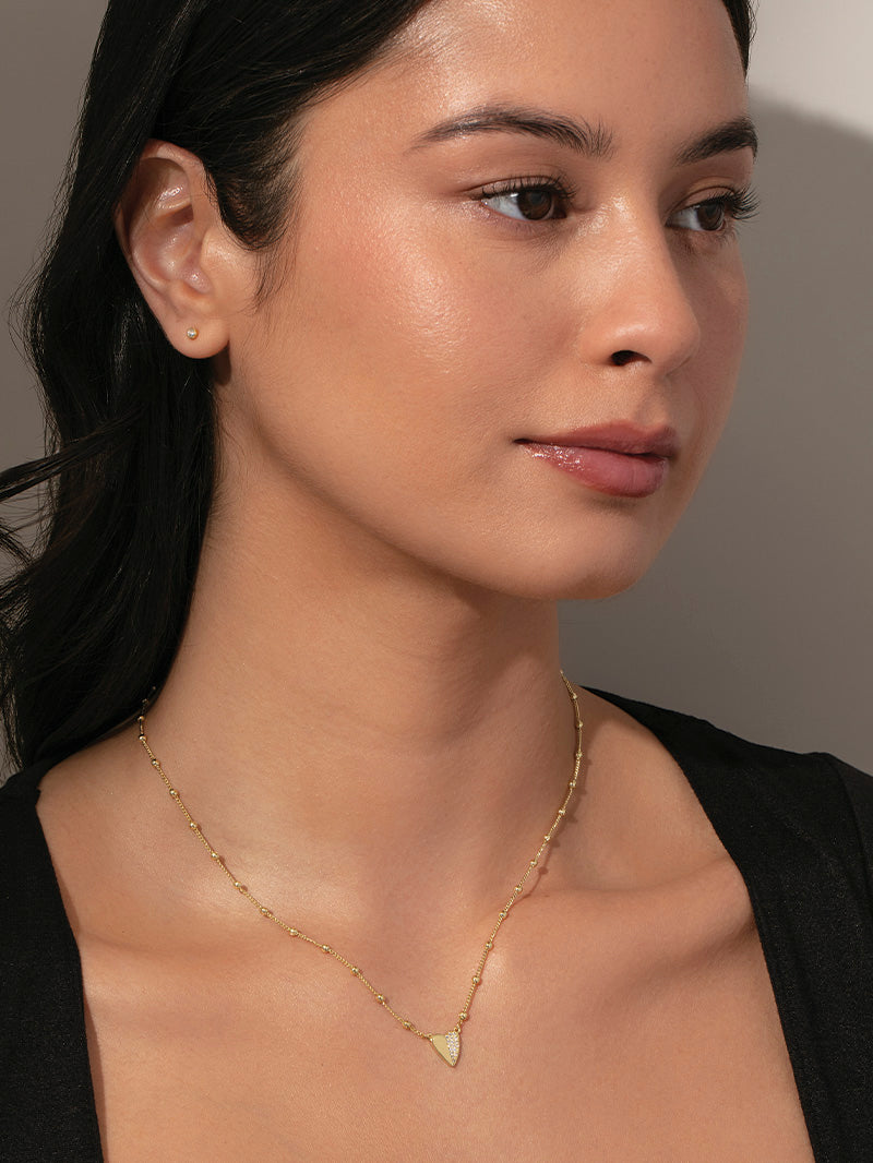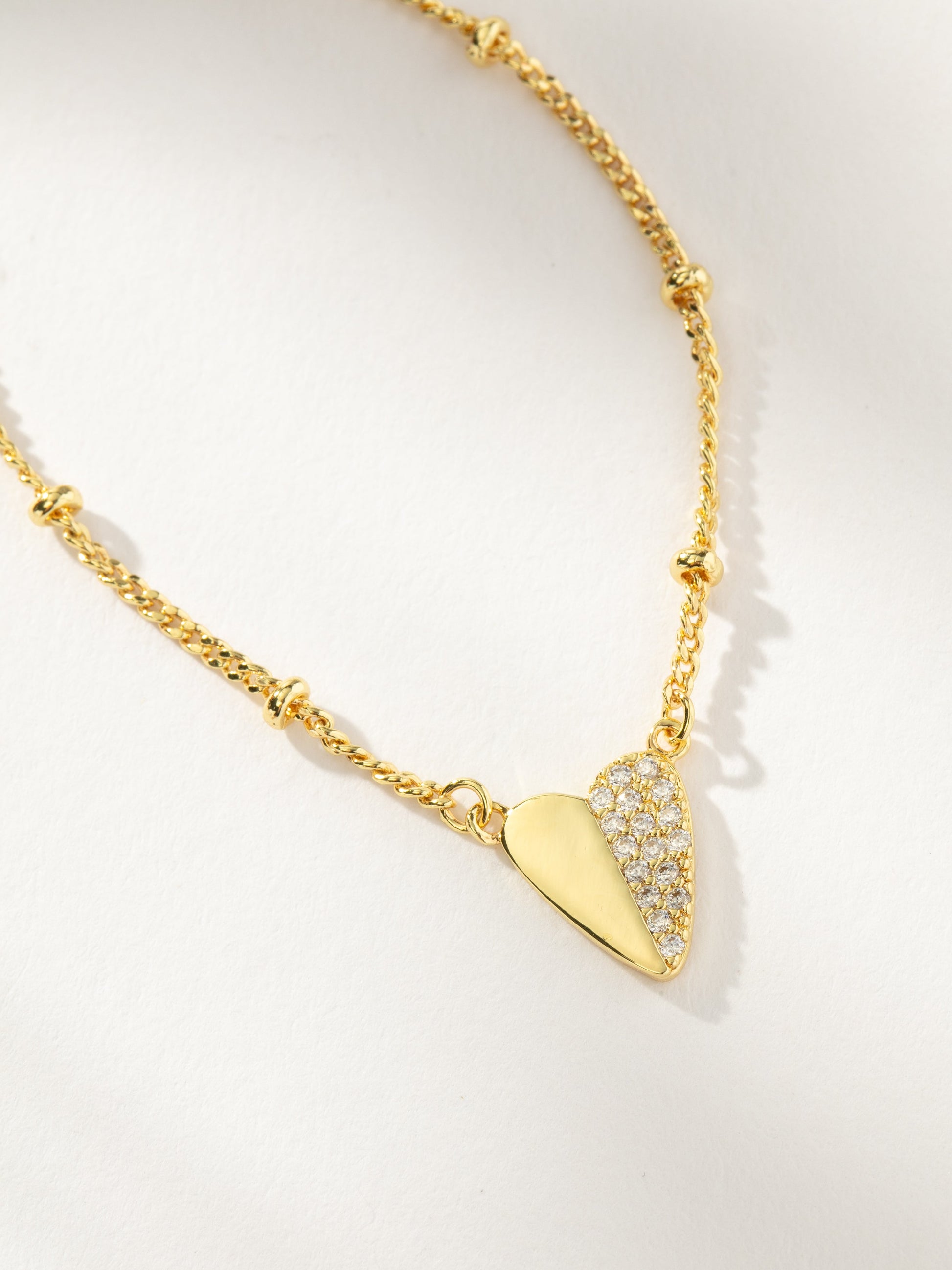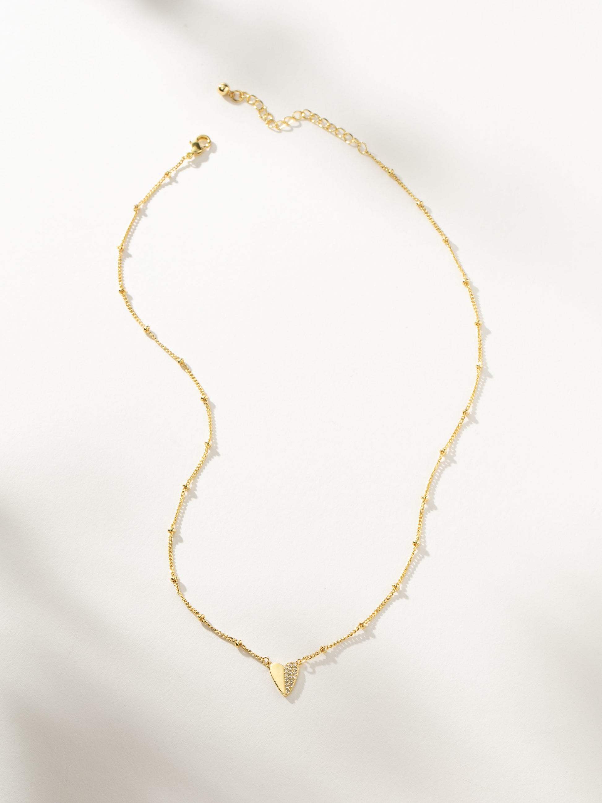 Our Other Half Heart Necklace is full of details you’re sure to love. Crafted with a dainty ball chain and a half gold, half pavé heart pendant, this gold necklace will effortlessly layer with the rest of your collection. To recreate Kristin’s look, layer this chain and pendant necklace with our Uncommon Pendant Necklace. Want more heart jewelry styles? Shop the Hearts Collection.