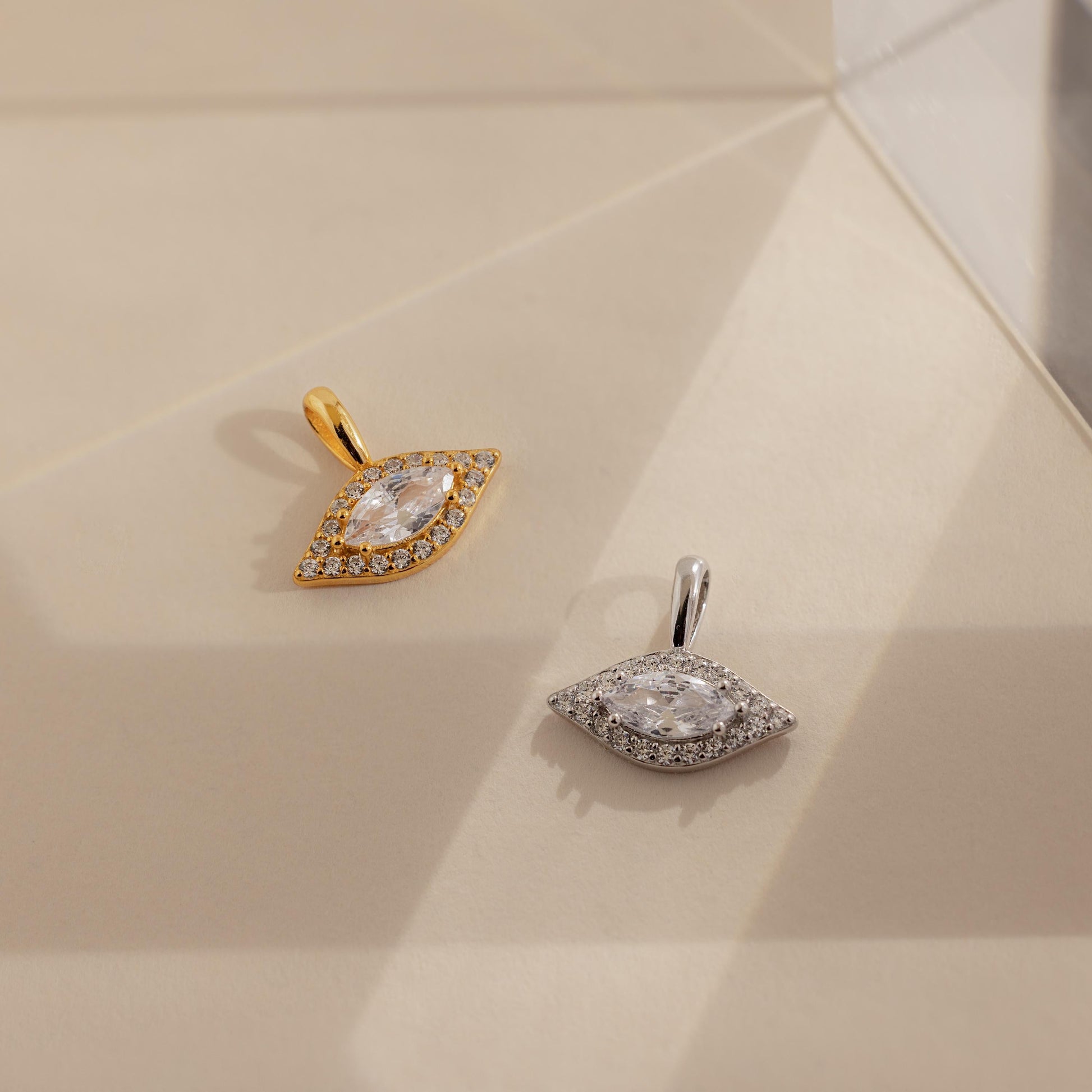 - Featuring a ~13.5x15mm Eye Charm with ~9.5mm CZ Diamond and ~1.5mm Pave Gemstones