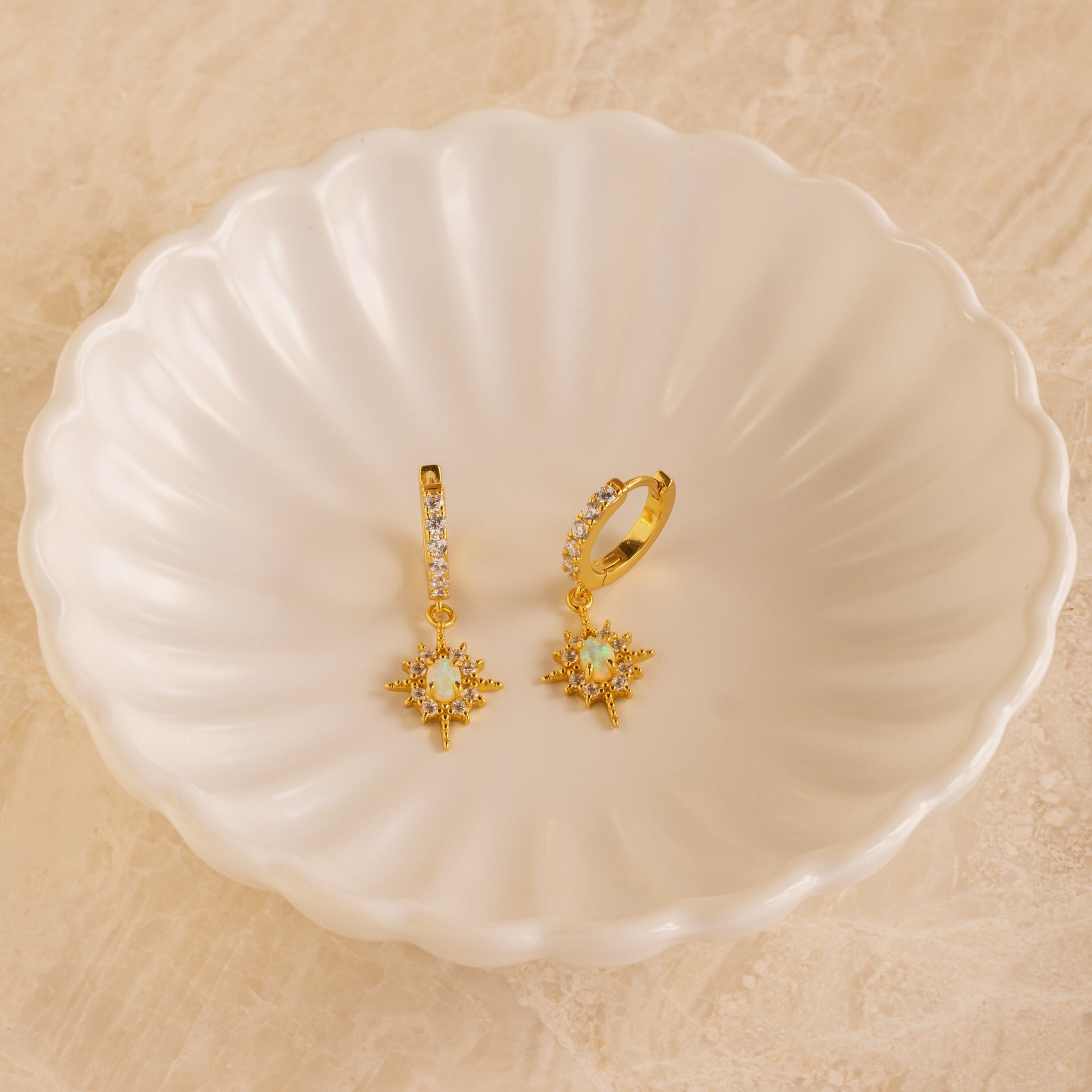 - Featuring ~2mm wide Huggie Hoop Earrings with 12mm x 10mm dangling CZ Opal Star Charm