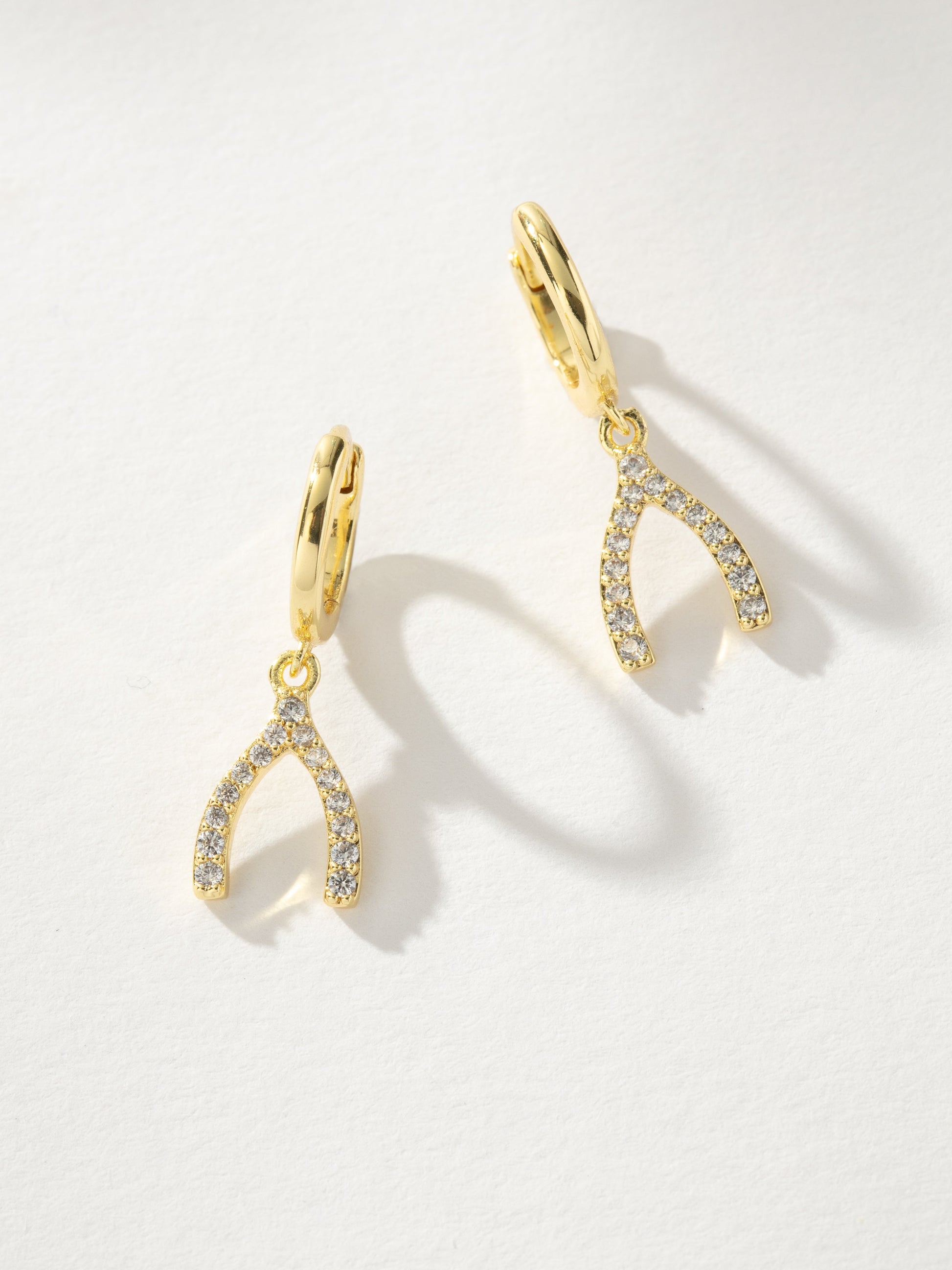 Crafted with a simple huggie earring and a pavé wishbone charm dangle, these silver or gold earrings are sure to bring you some good luck. For some extra shine, pair our Pavé Wishbone Drop Huggie Earrings with your favorites from our Just Add Sparkle Collection.