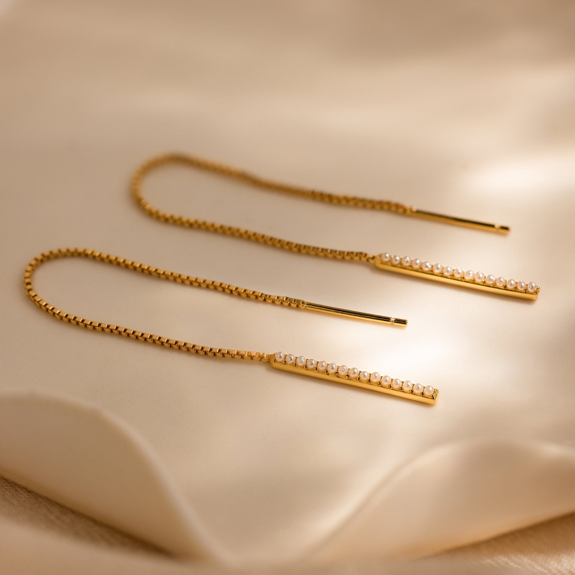 - Featuring ~95mm Threader Chain Earrings with a ~18x1.5mm dangling Pearl Bar