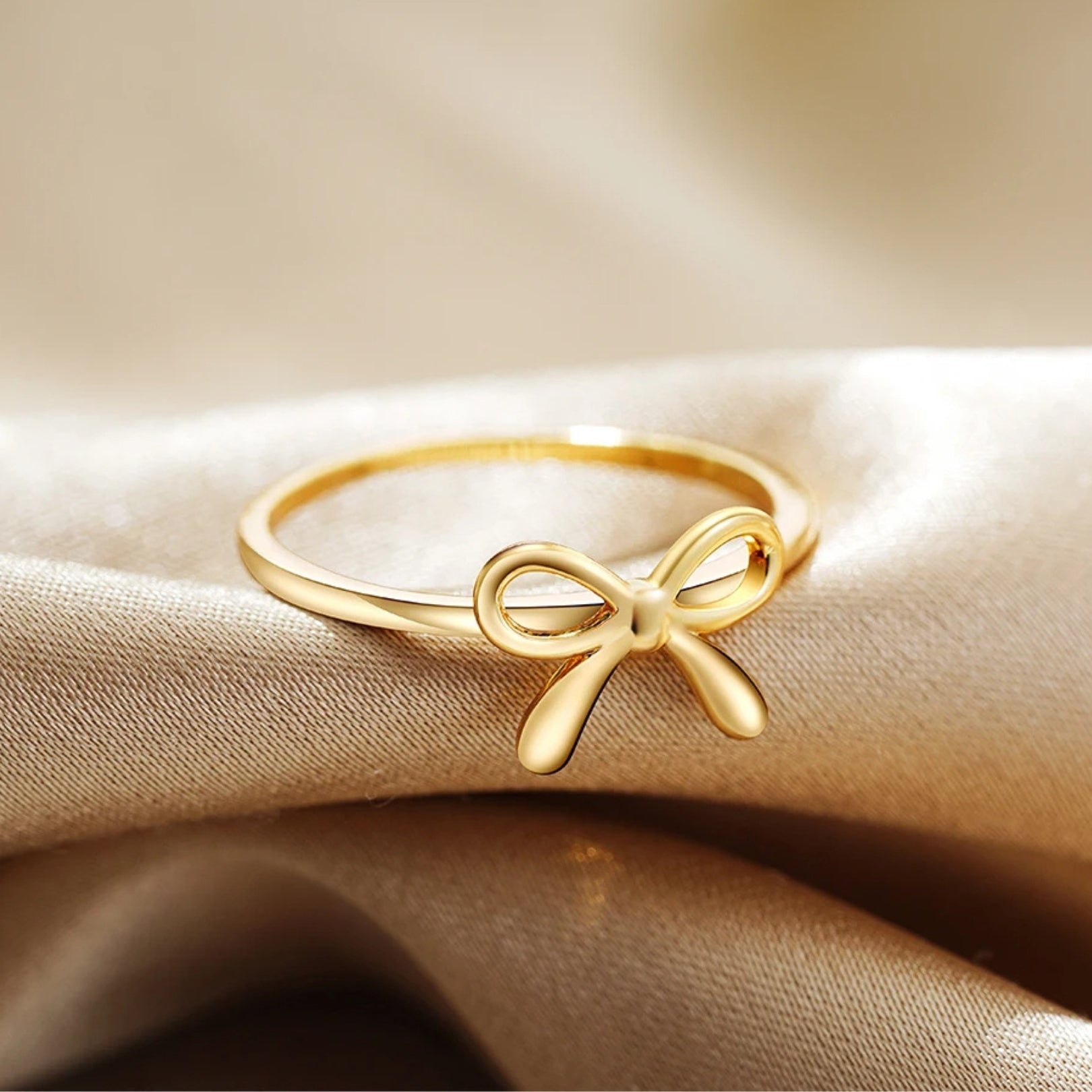 Add a hint of charm and sophistication to your style with the Ribbon Knot Ring. Featuring a dainty bow design on a slim, polished gold band, this ring exudes a delicate, feminine appeal that’s both playful and elegant.