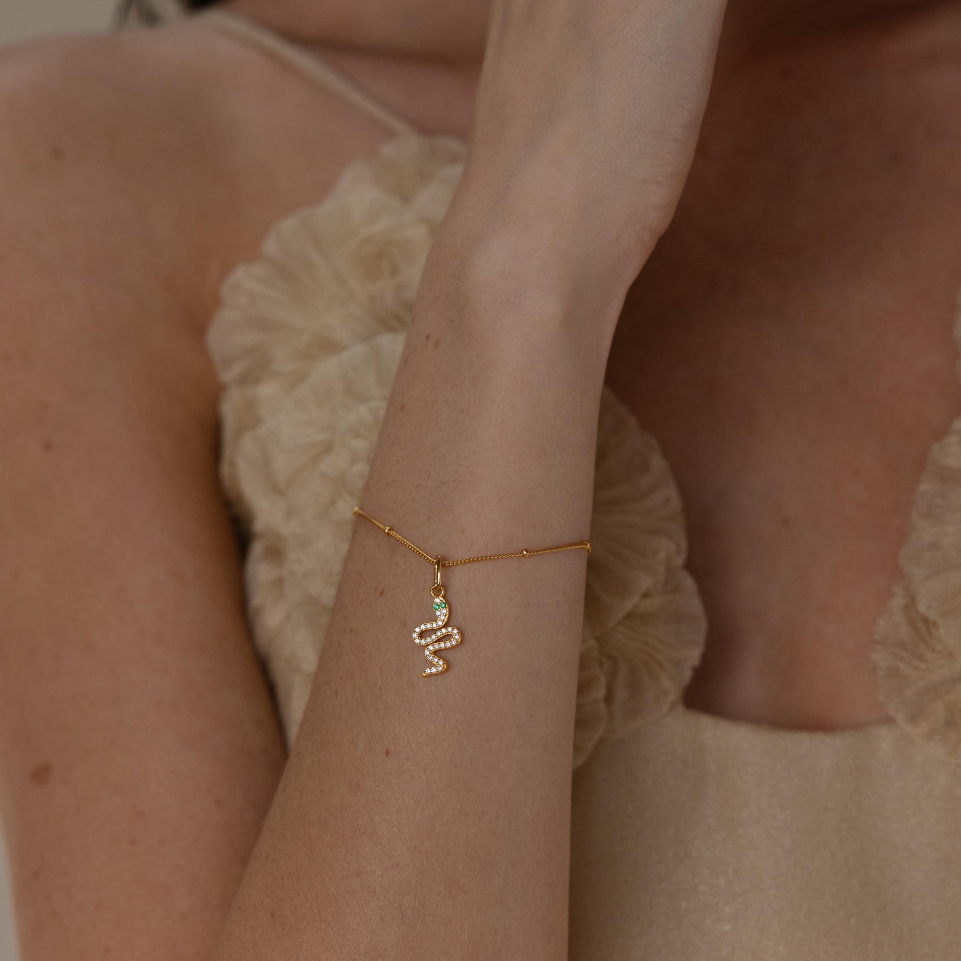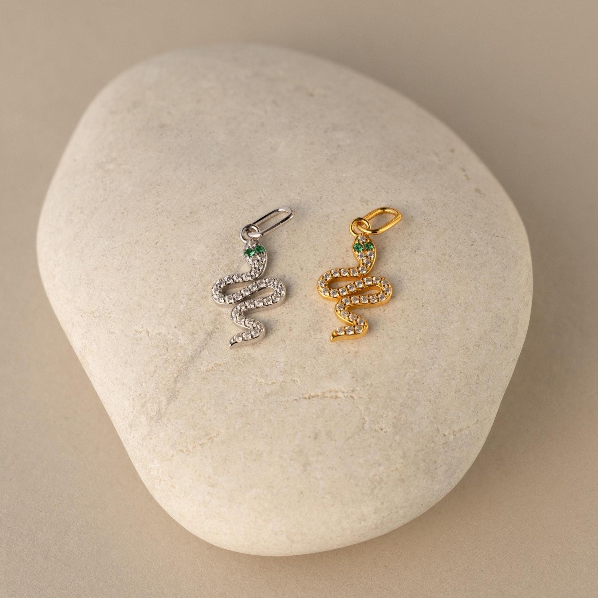 Add a hint of mystery with our Diamond Snake Charm, decorated with shimmering Diamond Pave stones and captivating green Emerald eyes. A bold yet elegant treasure, it gives an enchanting edge to any bracelet or necklace!