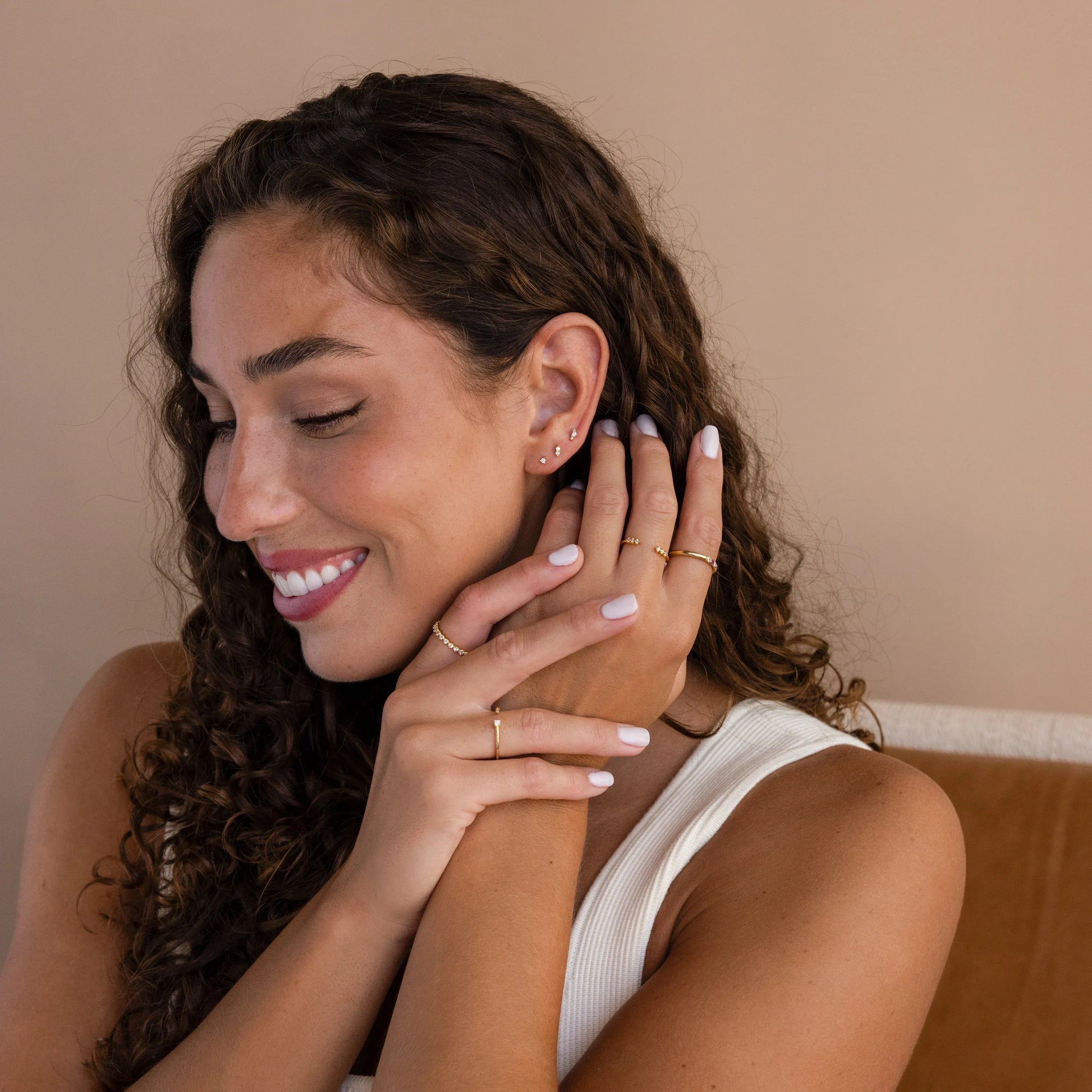 - Model showcases a lively, matching ring look featuring our Serafina Diamond Ring, Mini Birthstone Ring, Cecilia Pave Ring, and Eternity Tennis Birthstone Ring.