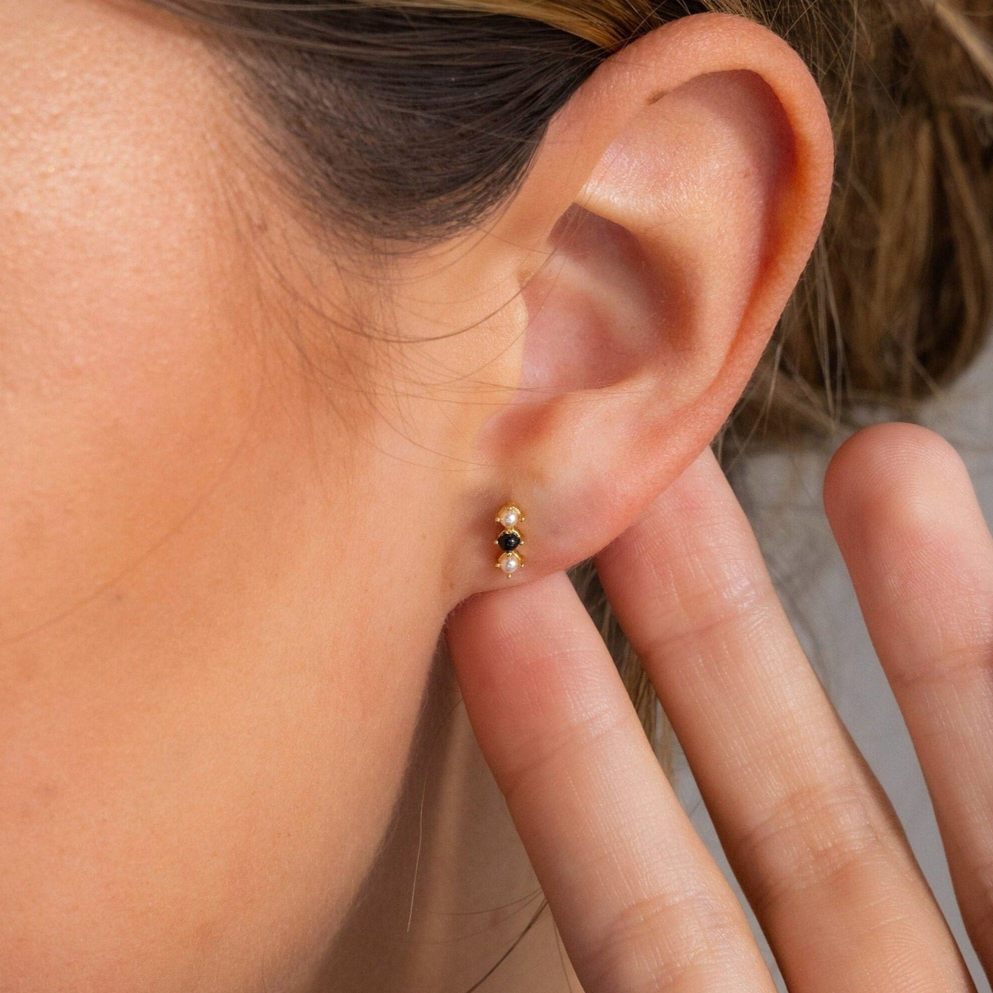 Our Tiny Onyx Pearl Bar Studs features a sleek bar design with an Onyx stone at the center and two Pearls on each side. These versatile earrings add a touch of chic elegance to any outfit, perfect for both everyday wear or special occasions.